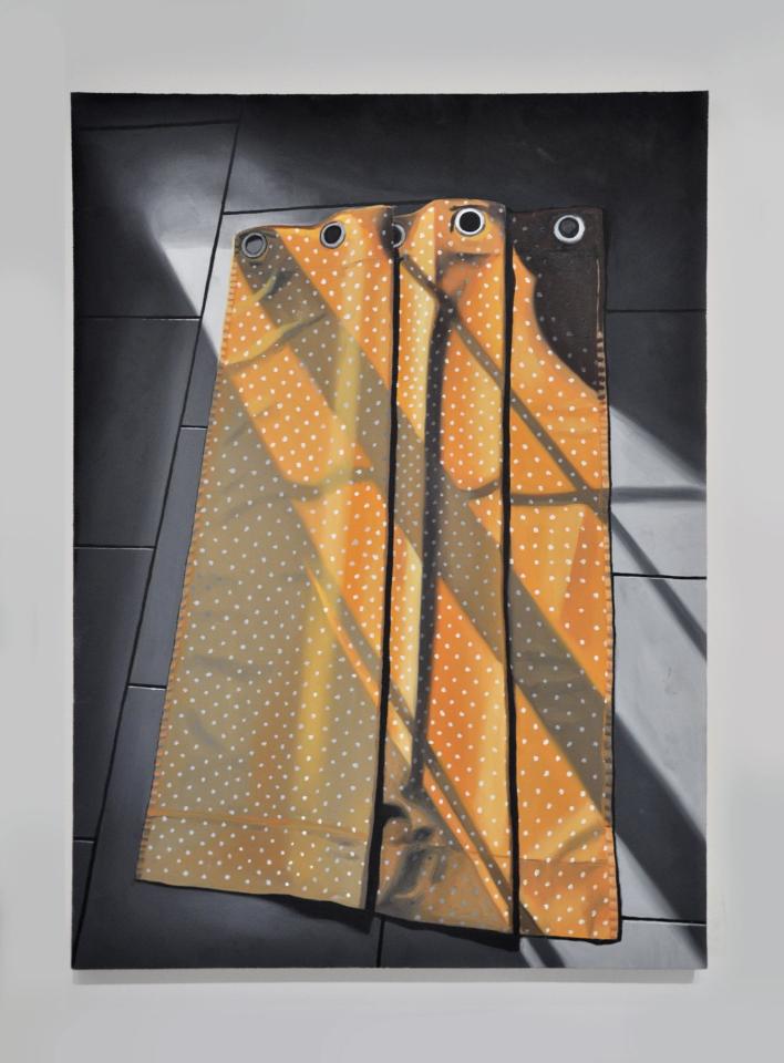 Rideau (idéal chambre d’enfant), 2022, huile sur toile, triptique, 75 x 50 cm chacune, vue de l’exposition personnelle Comme si…, 2022, Galerie Aperto, Montpellier, détail