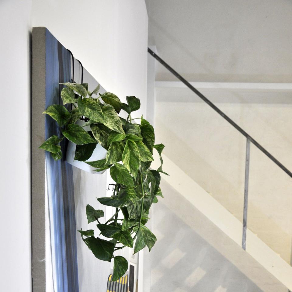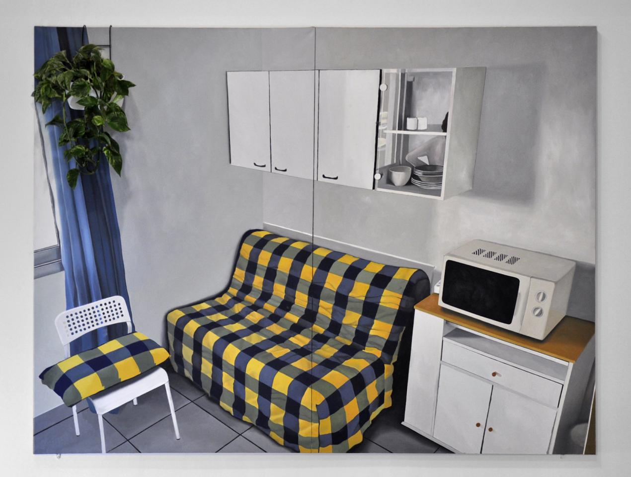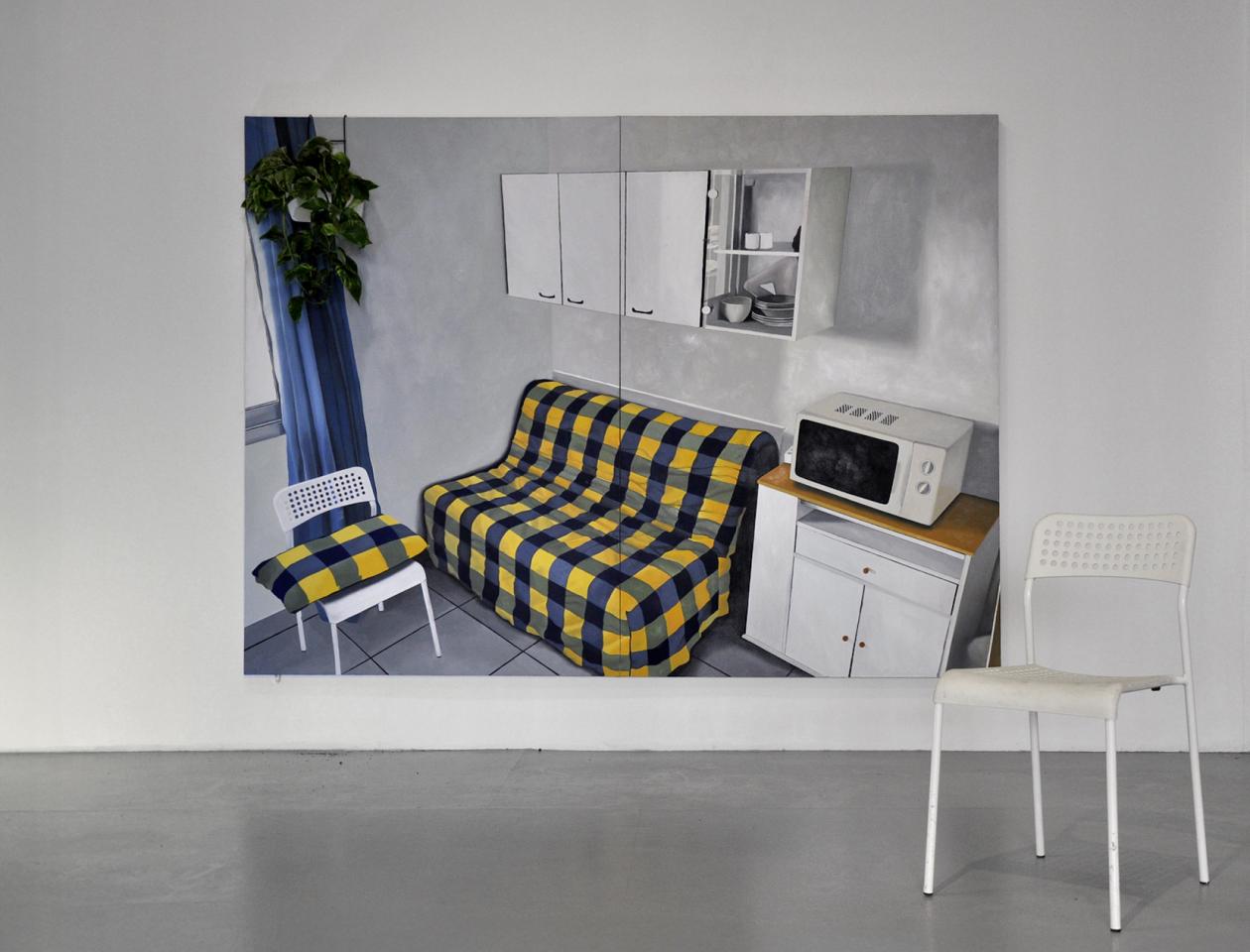 Studio curistes, 2022, huile sur toile, pothos et chaise en PVC, 180 x 240 cm, vue de l’exposition personnelle Comme si…, 2022, Galerie Aperto, Montpellier, détail