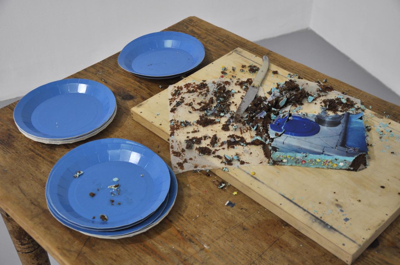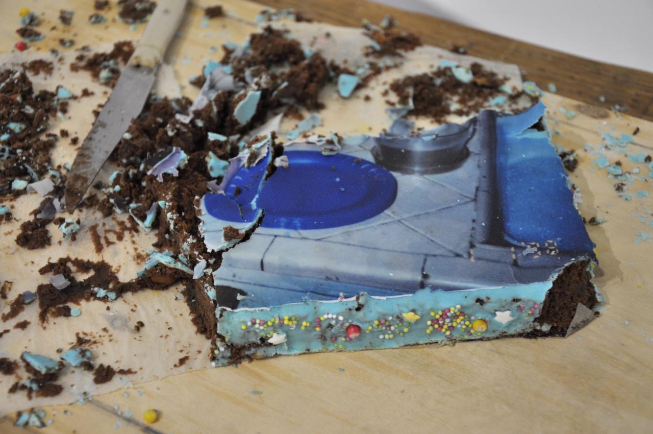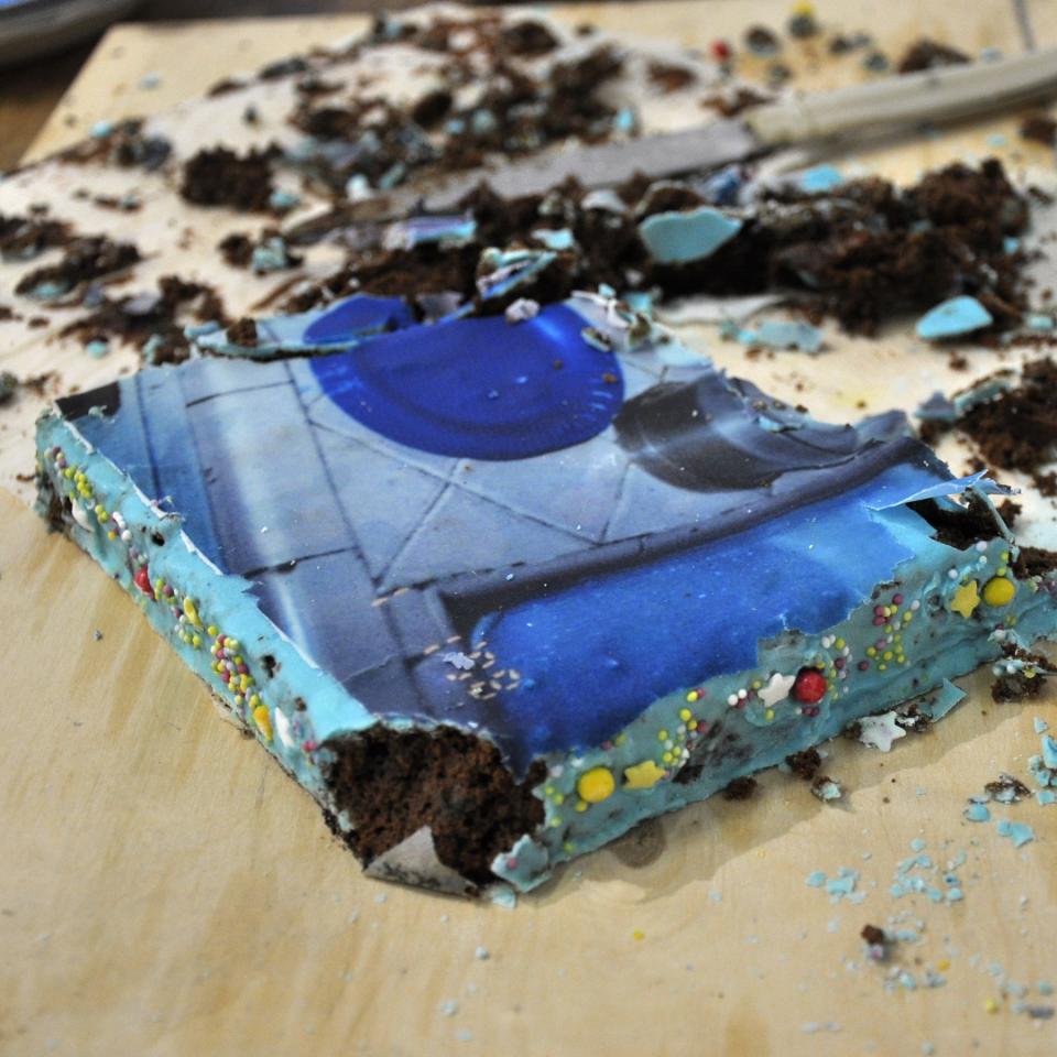 Cake sur cake, 2022, gâteau au chocolat avec impression sur pate à sucre, vue de l’exposition personnelle Comme si…, 2022, Galerie Aperto, Montpellier, détail