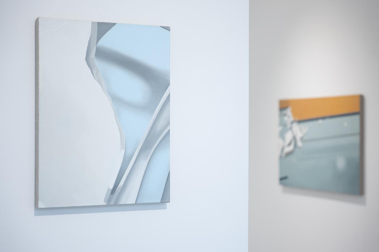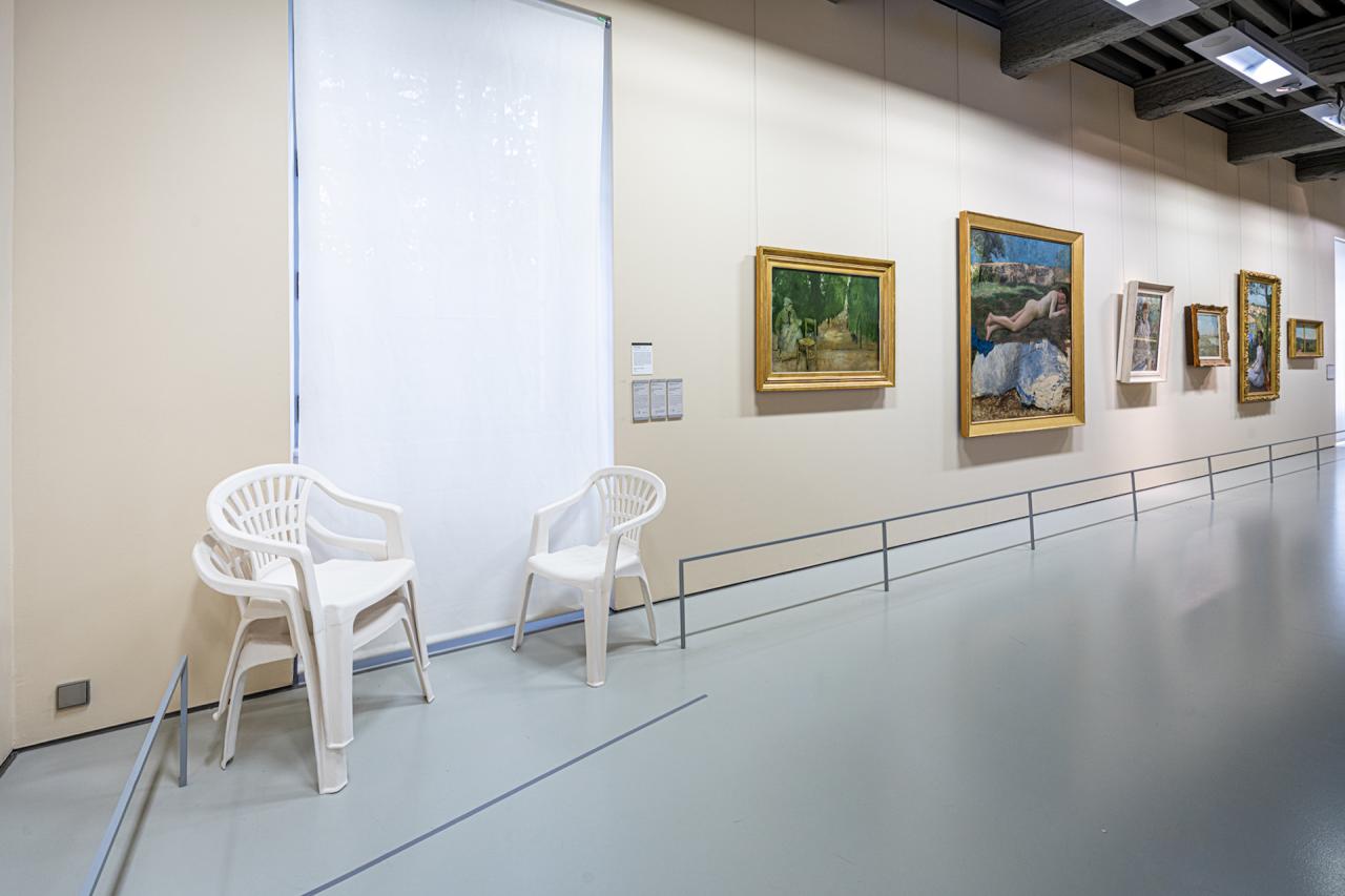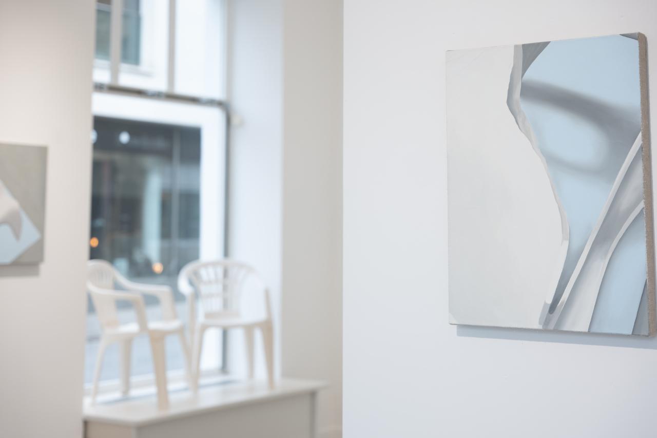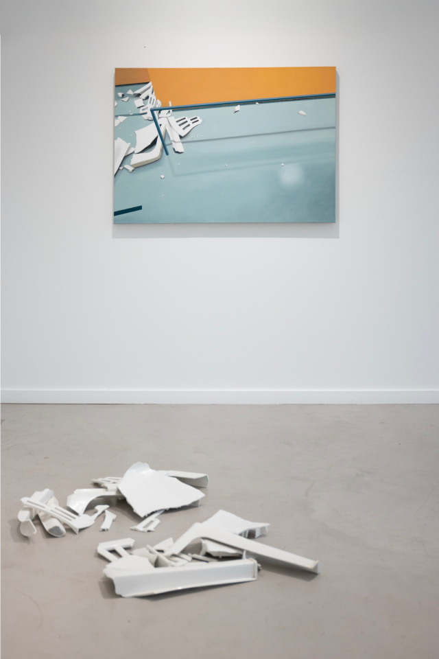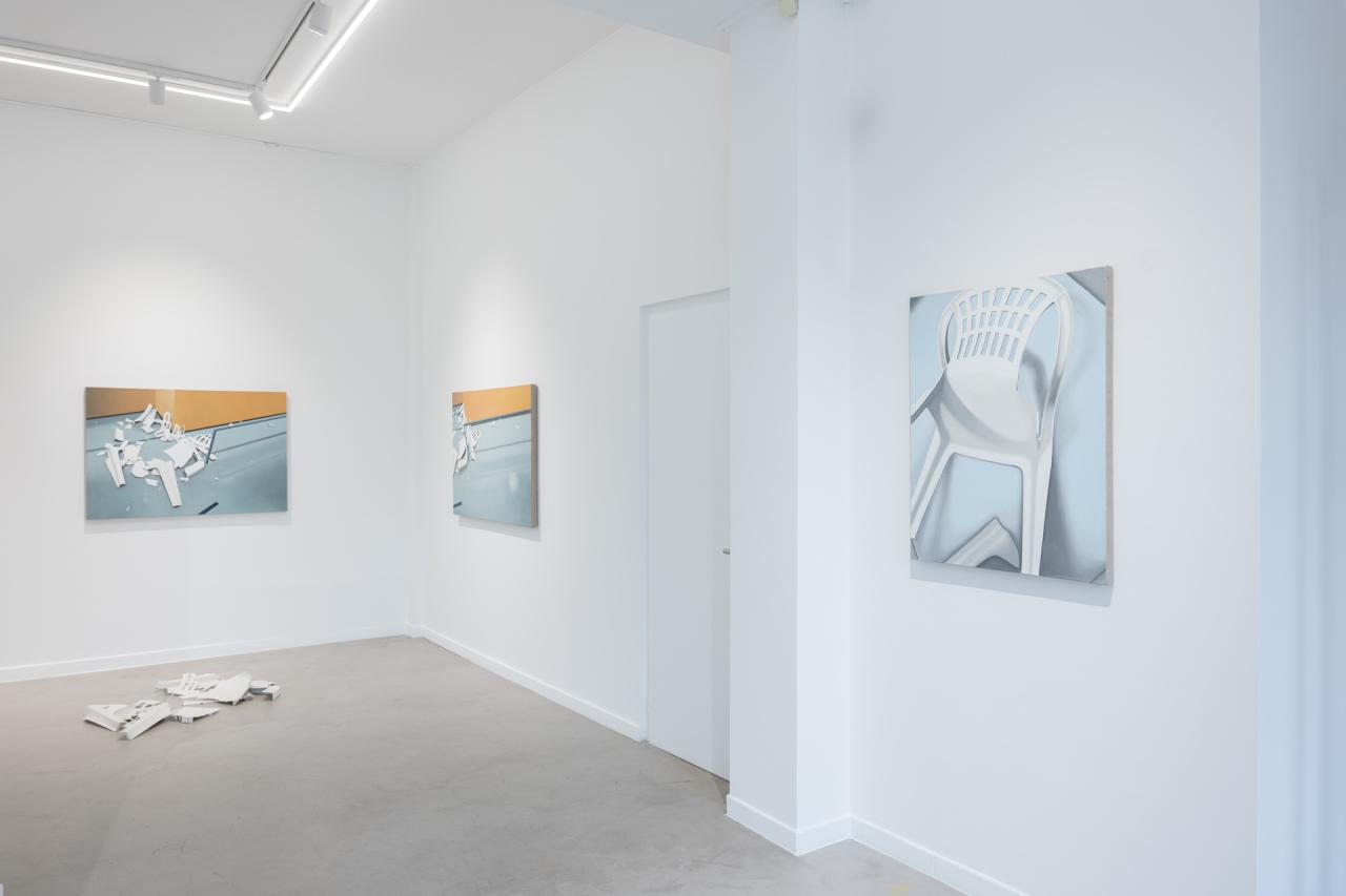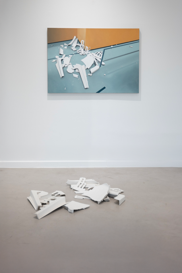 Nouveau sinistre, 2023, ensemble de 2 toiles, dimensions variables et débris de chaise en polypropylène, dimensions variables