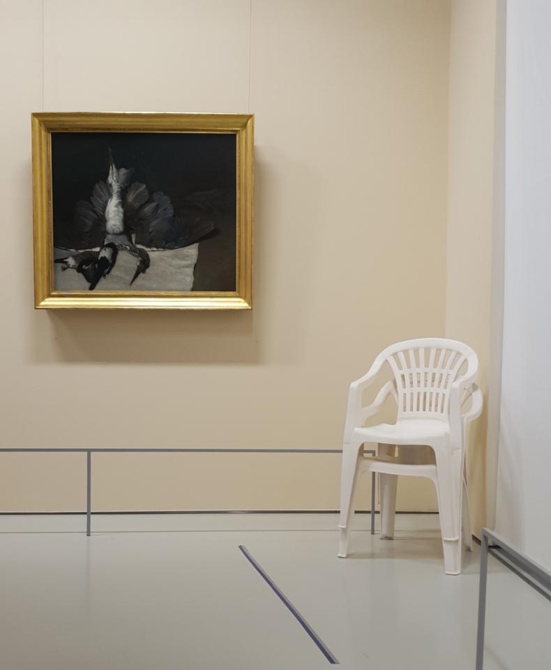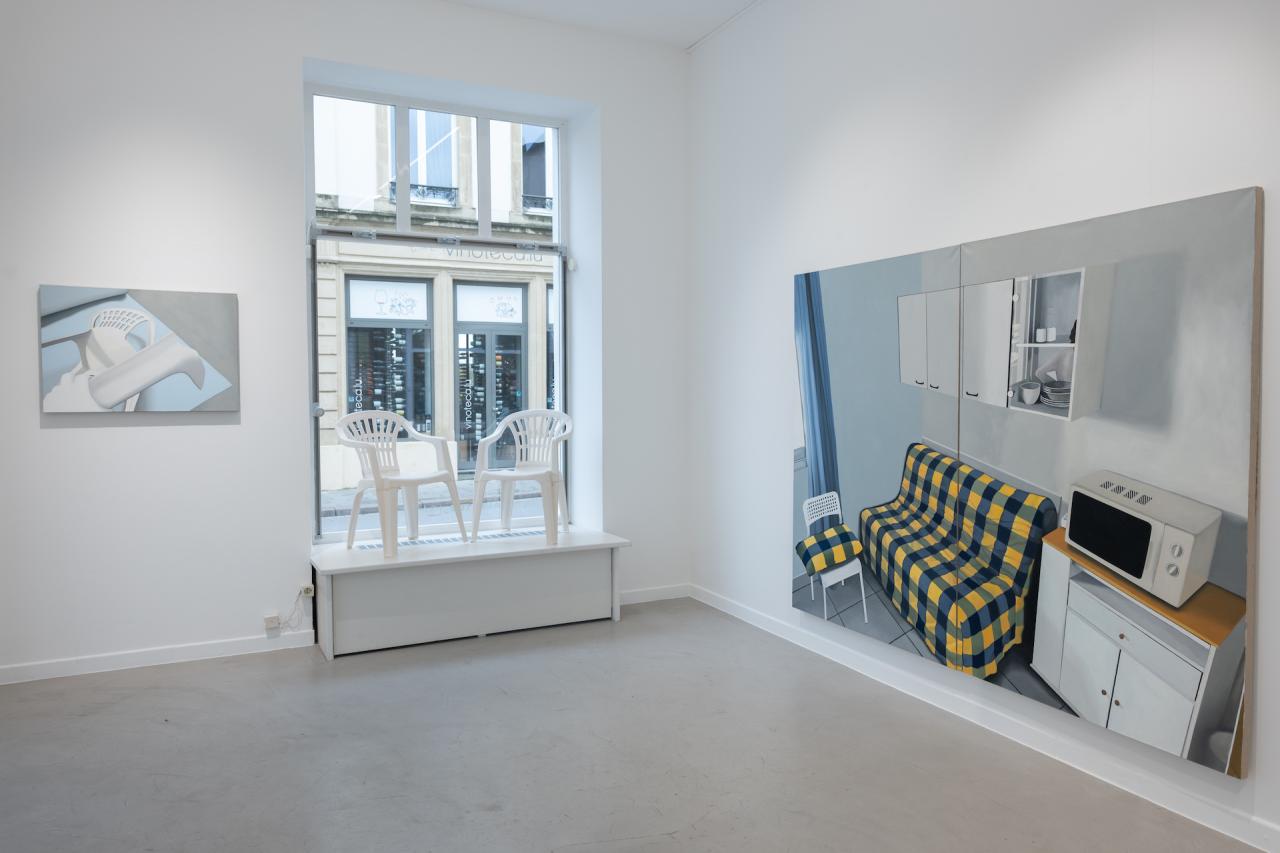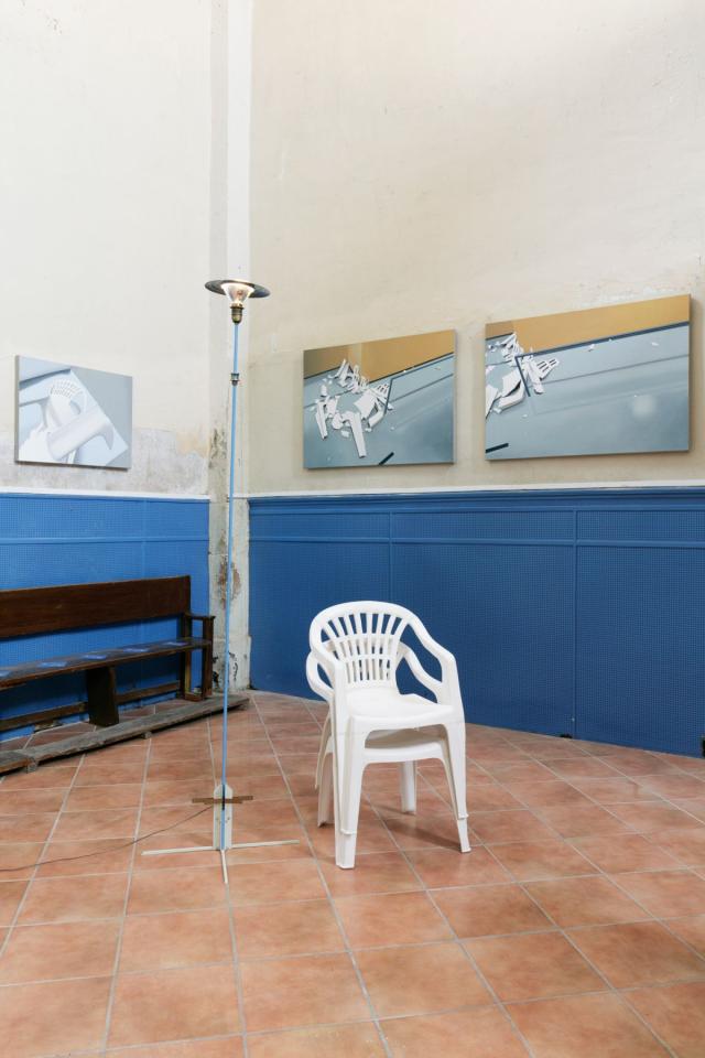 L’installation de Sam Krack qui forme Sinistre(s) manifeste avec malice cette quête d’éternel propre à la sacralisation de l’oeuvre d’art. Composée de deux chaises de jardin reproduites en faïence blanche, de débris en plastique d’une de ces mêmes chaises, ainsi que de cinq toiles, l’oeuvre est née d’un sinistre survenu sur une œuvre précédente, Monobloc (Salon de jardin), exposée dans un cadre muséal et détruite par un visiteur trompé par la transcription fidèle de l’objet réduit à sa fonction d’usage : l’installation détournait, en l’anoblissant dans un matériau fragile, l’une des assises les plus bon marché, standardisée, attribut par excellence d’une vie de campagne réduite à un morceau de jardin. Un renversement de l’oeuvre initiale s’opère à travers la reprise des débris de céramique en plastique, par lequel la chaise retourne à son matériau d’origine. Ce procédé, associé à la reproduction en peinture des photographies documentaires nécessaires aux constats d’assurance, en même temps qu’il mime les procédures de classement et de mémorisation administrative des évènements, témoigne d’un exercice temporel laborieux et lent, quasi absurde, de résistance artistique à la brièveté de la matière.