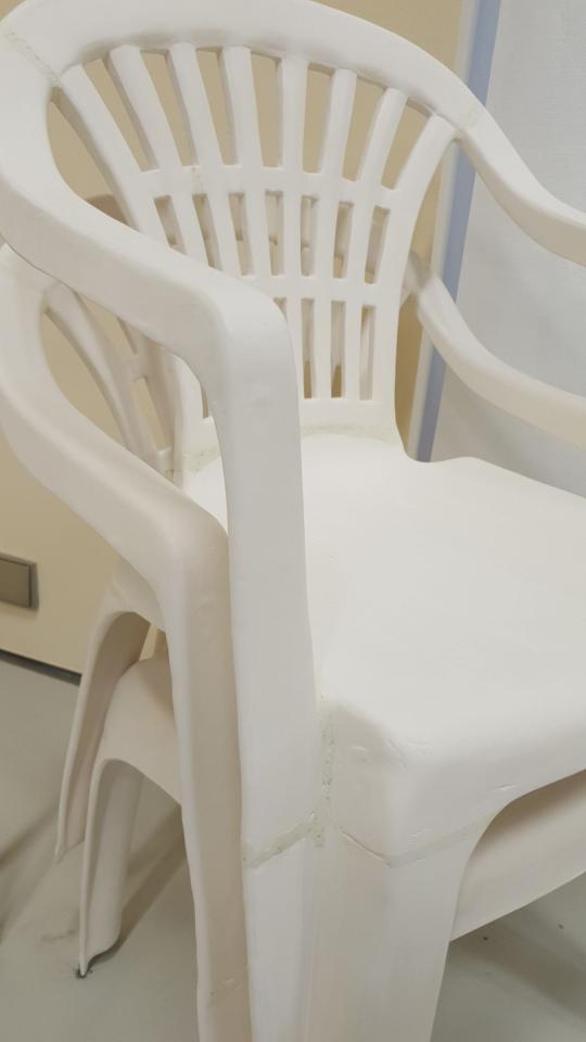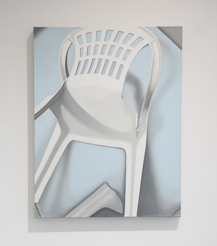 Les chaises en céramique de Sam krack prolongent sur le plan sculpturel le geste qu’il accomplit dans ses tableaux. S’il transpose en peinture des images sans qualité issues de sites marchands, les chiases en plastique qu’il reproduit appartiennent aussi au registre du banal. Leur forme commune s’accompagne d’un aspect industriel et bon marché. La céramique vient renverser ces caractéristiques, l’objet devient ainsi fragile et artisanal. Empilées l’une sur l’autre, ces trois chaises conservent néamoins une part de fonctionnalité de leur modèle.