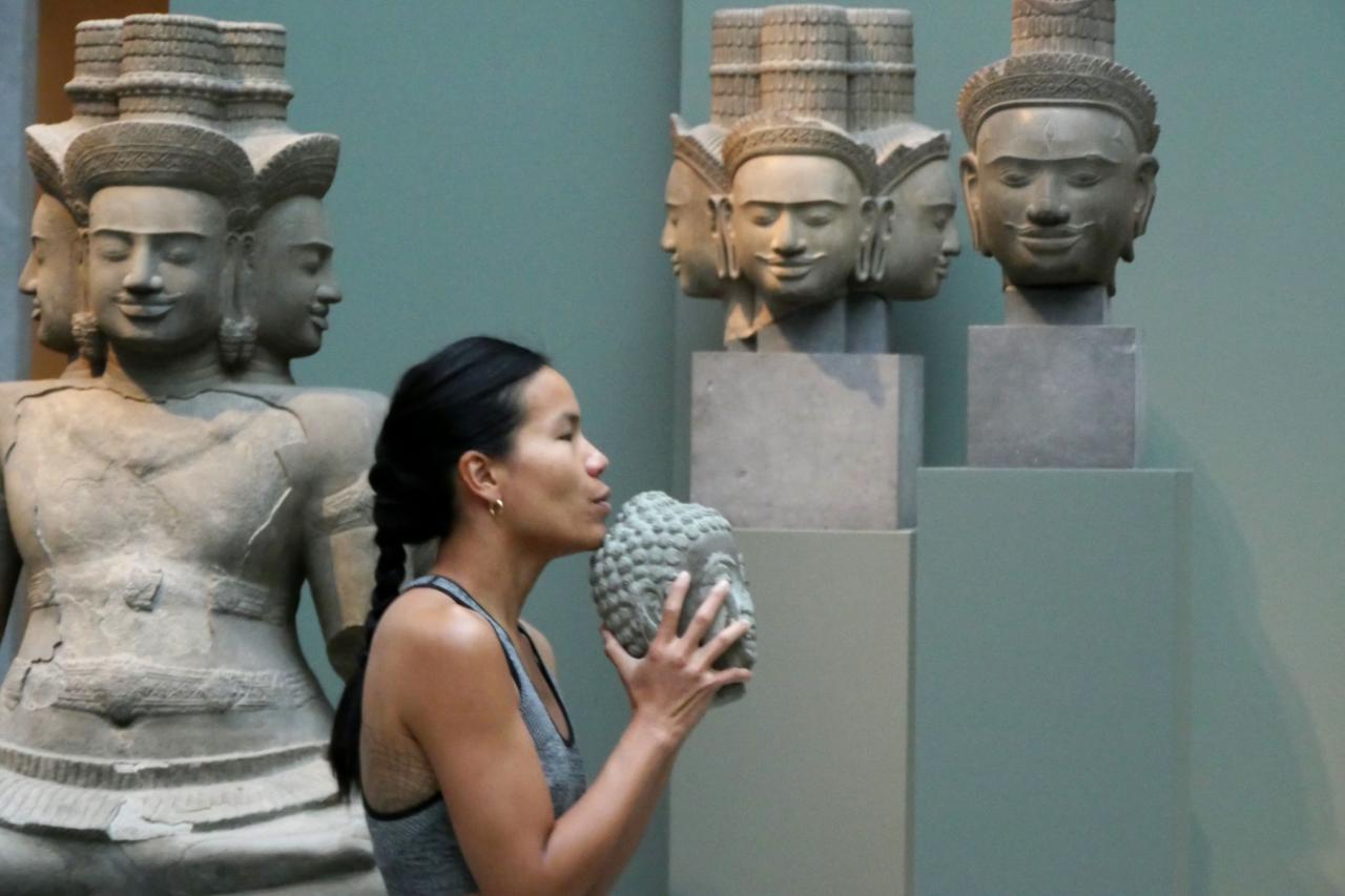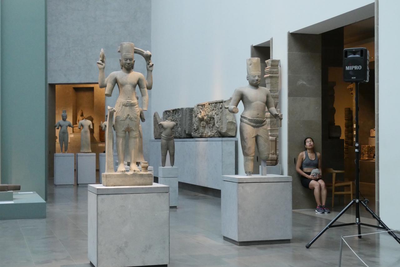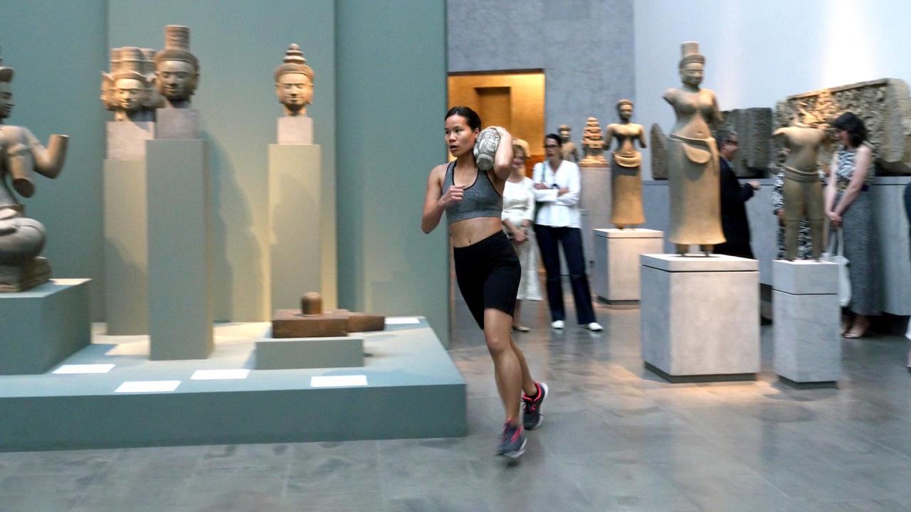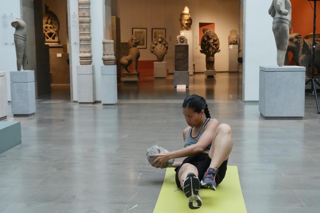 La tête de bouddha est portée au cours d’un entraînement sportif dans les espaces du musée. Je cherche les moyens de me déplacer et de trouver mon équilibre avec cette lourde tête qui m’accompagne. Elle ralentit mon allure, elle semble être une entrave à mon parcours, au fur-et-à mesure elle se blottit contre mon corps, elle me renforce et me stimule. Porter/peser le poids de cette tête de bouddha au contact de mon corps, de mes mains, de mon visage, me permet de me réapproprier mon héritage et de rendre visible la relation au présent avec les sculptures de la collection du Musée Guimet.