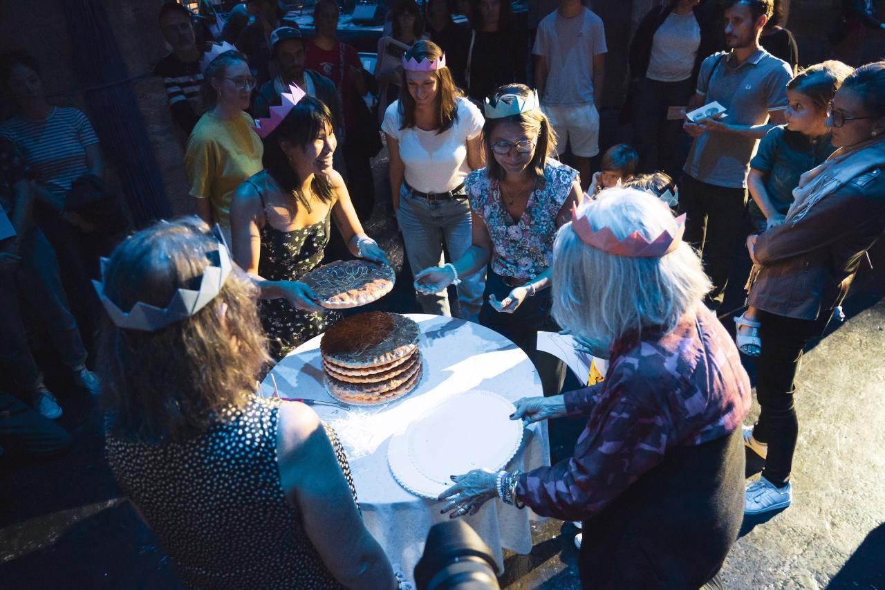 2023 : CAPC, Bordeaux, dans le cadre des 50 ans du CAPC, invitée par la plateforme curatoriale Föhn, 1200 ballons, bolduc, 6 galettes frangipane maison, 6 couronnes, 50 bougies, invitation papier, faux ongles, 30 min