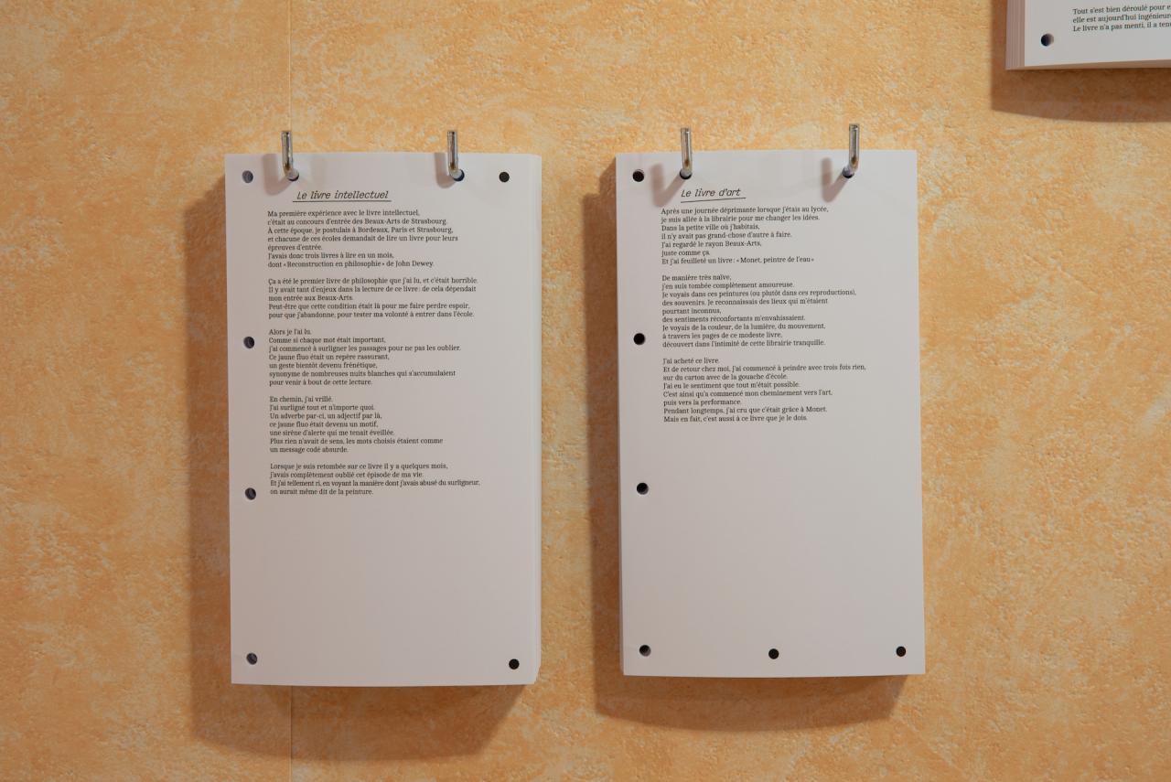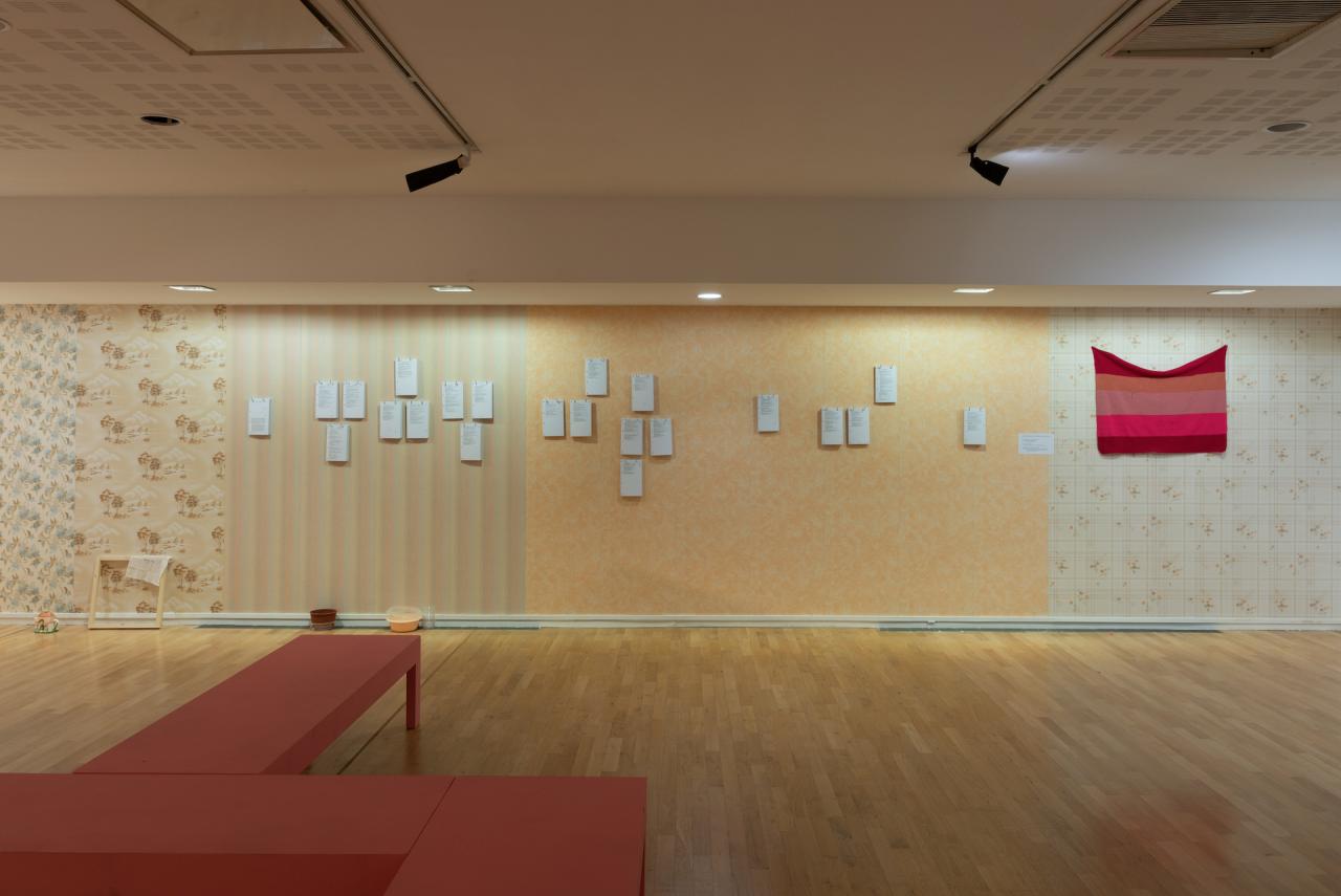 Les petites mémoires, 2018-2025, 21 textes sur feuilles, crochets en métal et papier peint, en collaboration avec mmm collectif pour le graphisme, vue du projet d’exposition Jardin secret, 2025, dans le cadre de l’exposition collective Mezzanine Sud – Prix des Amis des Abattoirs, 2025, Les Abattoirs, Musée – Frac Occitanie Toulouse, Toulouse, détail, photo mmm collectif