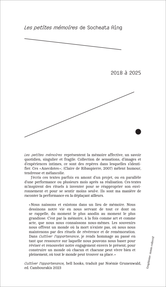 Dans ses formes, ses mots et ses gestes se reformulent alors des trajectoires et des héritages multiples, qui éclosent en fleurs nouvelles qu’elle s’amuse à replanter ici et là, partout où elle va. Du Cambodge lointain de ses parents au balcon de l’appartement familial en région parisienne, les souvenirs intimes se mélangent aux anecdotes à repartager, la recette secrète d’un bon plat à la formule magique d’une performance réussie, les racines ancestrales aux fraîches boutures prêtes à éclore. L’artiste fait feu de tout bois pour faire ressurgir les histoires oubliées – celles laissées en héritage et la sienne –, pour honorer les morts que les mémoires des vivants font perdurer, et pour panser les blessures invisibles qu’elle apprend à suturer.