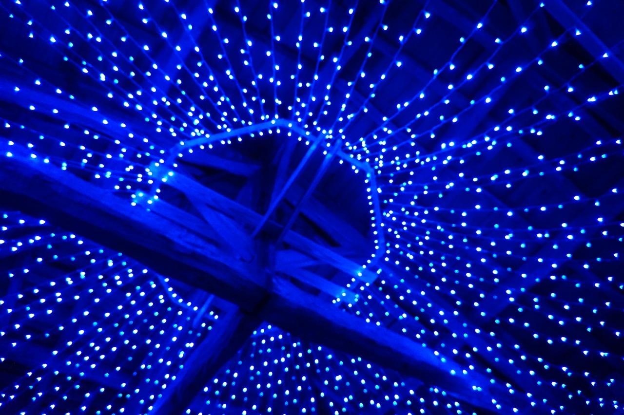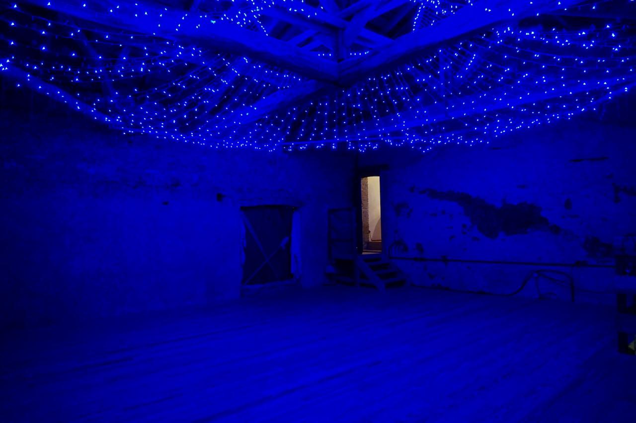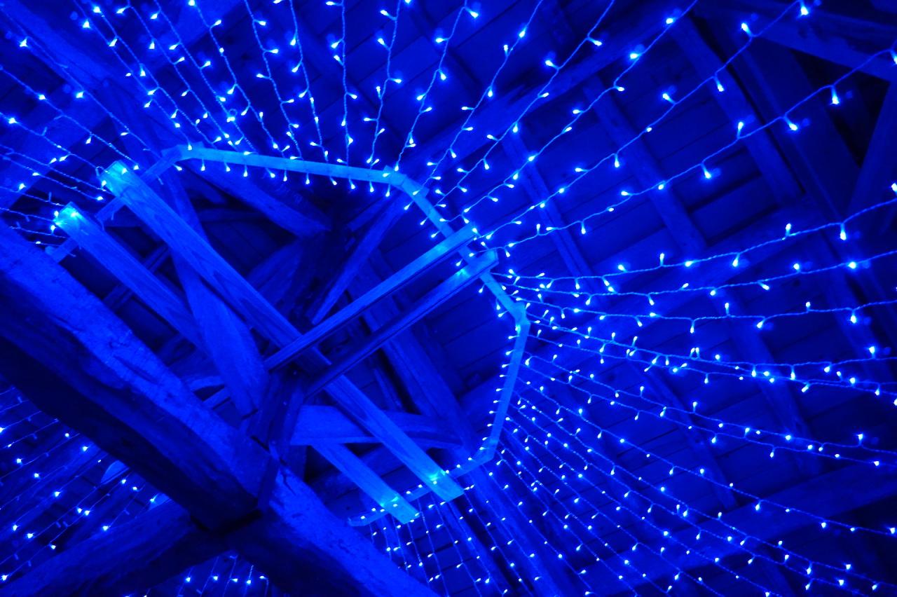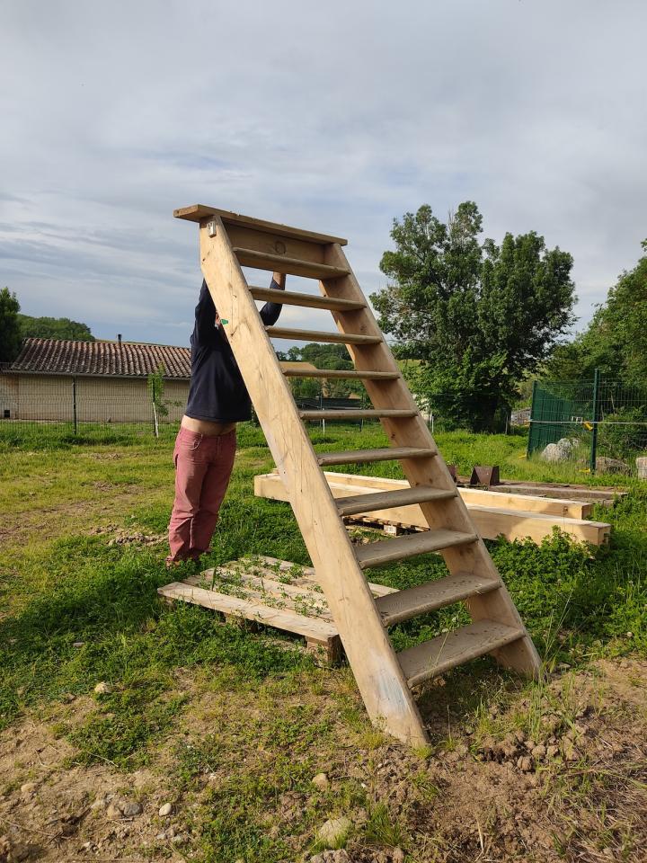Playlist avec 150 musiques, enceintes, guirlandes leds bleu, bois, escalier en bois