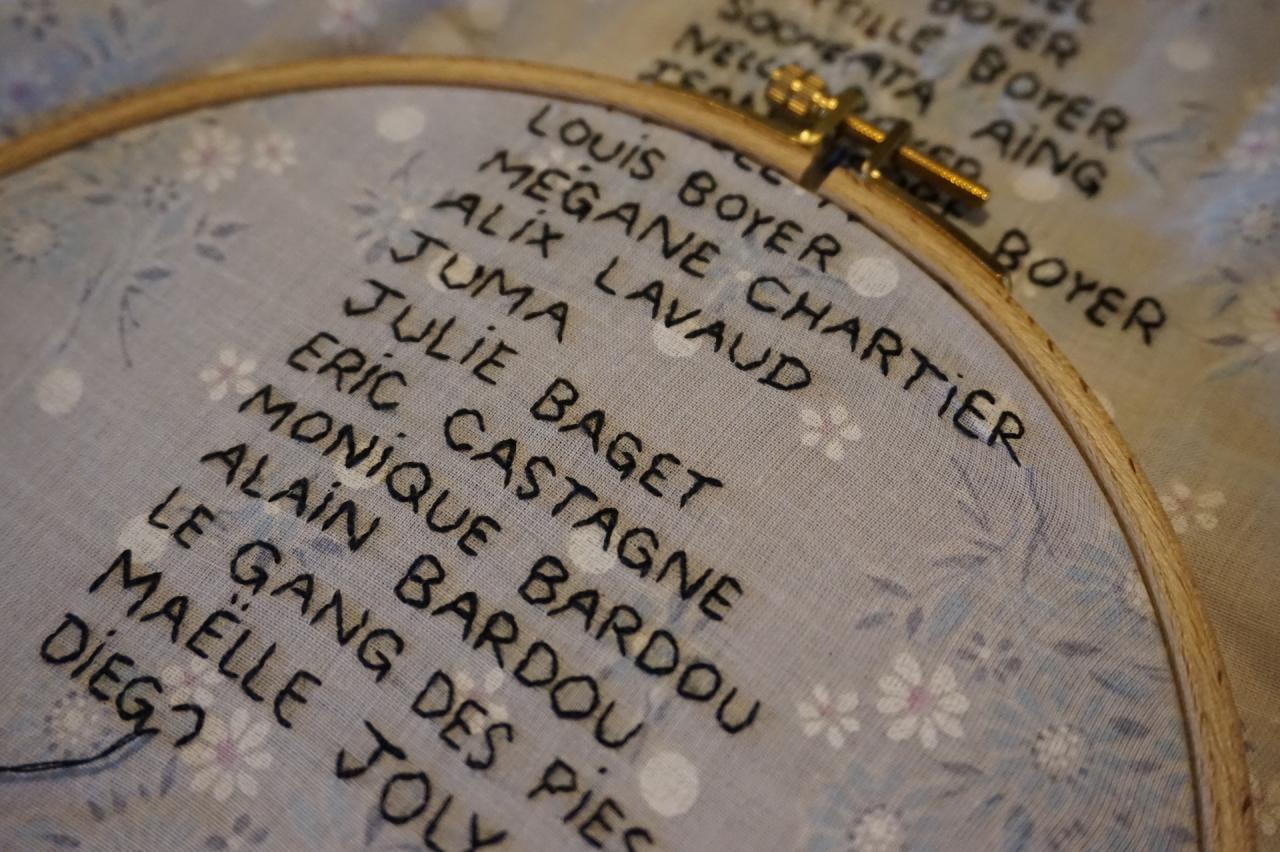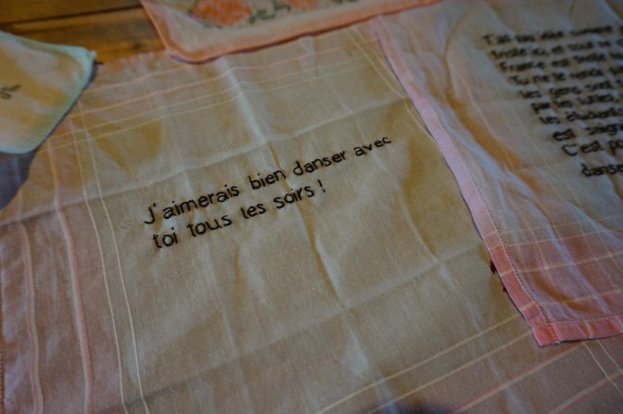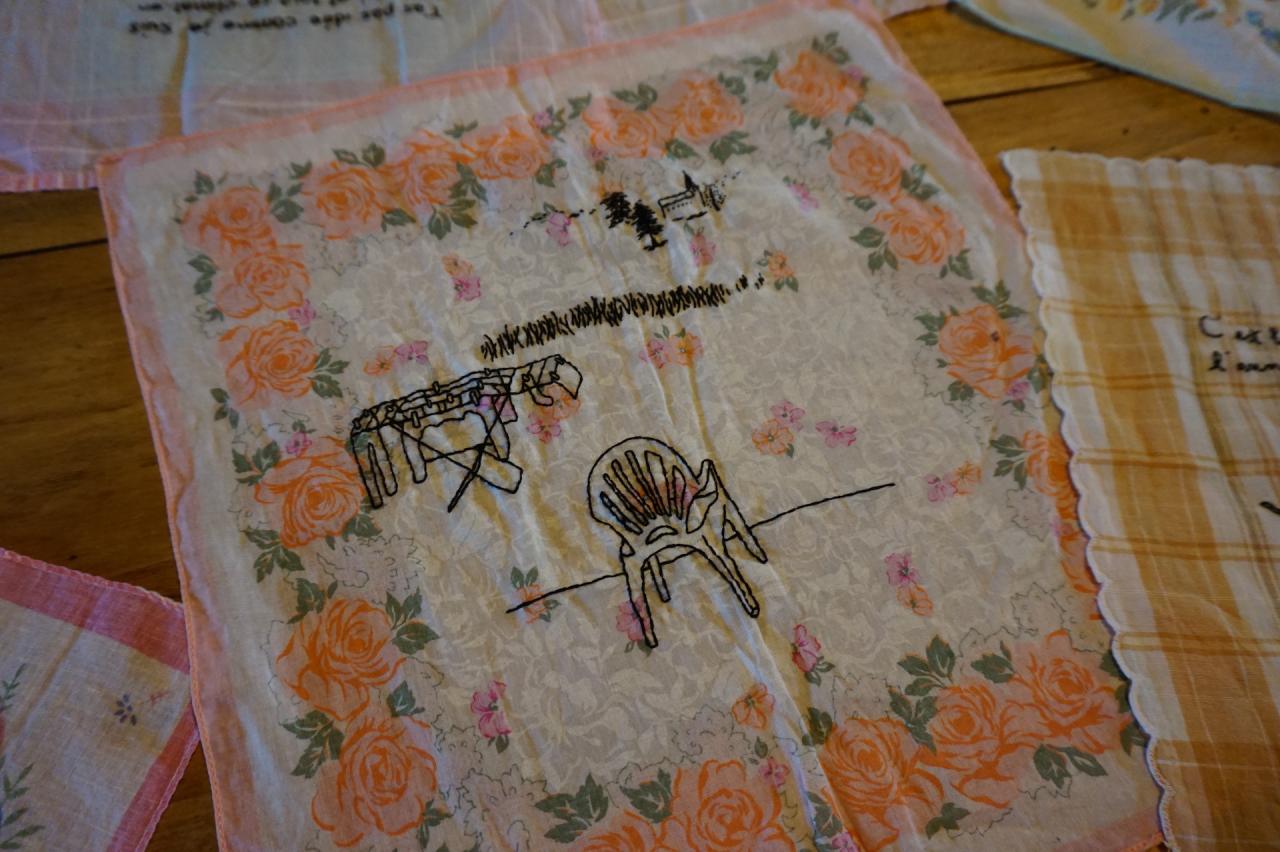 Série de 11 mouchoirs brodés, 2023, installation, Maison de la famille Boyer, Fiac