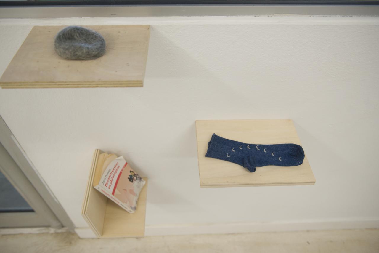 Stratosphère, 2024, chaussette et ongles, vue de l’exposition personnelle Les cheveux blancs de ma mère, 2024, Station V, Bayonne, détail, photo Le Second jeudi
