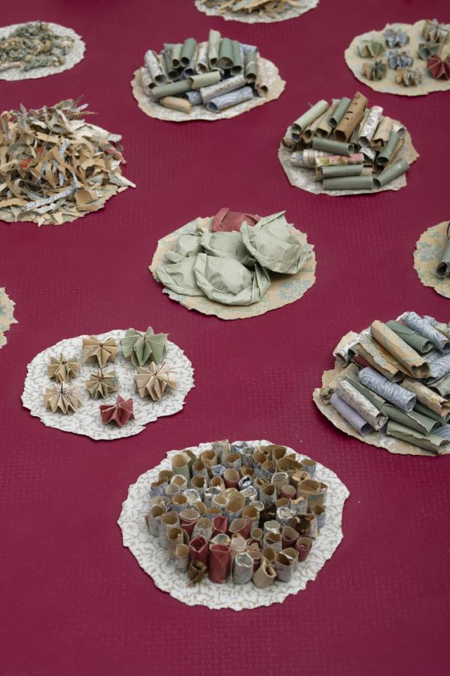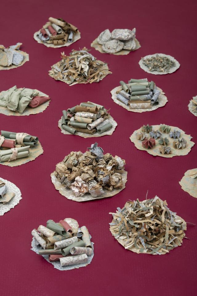 Pchum Ben, Fêtes des Ancêtres, des morts et de la rédemption, est l’une des cérémonies bouddhistes les plus importantes au Cambodge et dans les diasporas. Dans les pagodes ou à la maison, les familles se rassemblent autour des plats qu’elles ont préparé avec soin, en pensant aux membres qui les ont quittées autant qu’à celles et ceux qui sont restés. Au sol ou sur la table, les assiettes s’accumulent et les mets se partagent alors que brûlent les encens allumés pour convoquer à table les vivants et les défunts. Quand La Double Absence restitue les images du festin, le banquet de papier composé par Socheata Aing propose un nouveau partage. Composé lors d’une résidence au Ditep - Dispositif Institut Educatif et Pédagogique l’Essor Jean-Plaquevent de Saint-Ignan, ce banquet est la somme des histoires accumulées dans les fibres des papiers peints arrachés des murs de l’ancienne bâtisse où sont désormais accueillis les enfants qu’elle a accompagnés le temps d’un automne. Les couches de papier et d’histoires secrètes alimentent aujourd’hui les petites assiettes offertes à la dégustation intérieure.