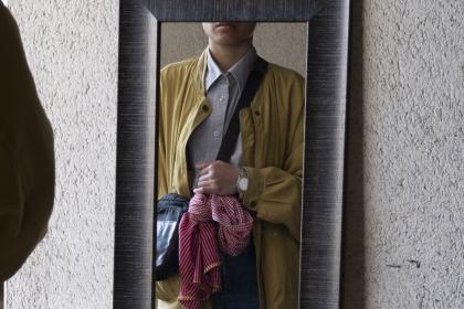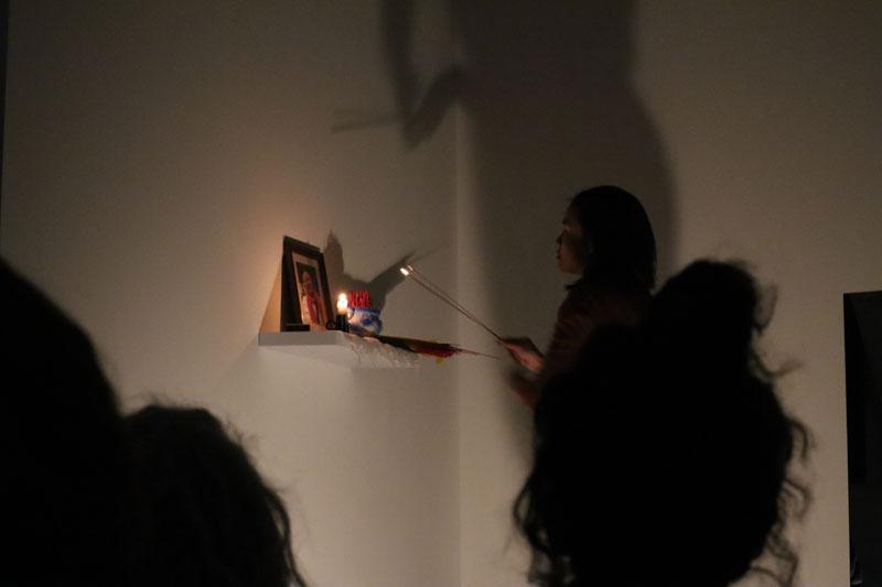 Durant la performance à l’atmosphère de clair-obscur, Socheata enfile des vêtements de son père, les uns sur les autres, les pantalons, les chemises, les pulls, les blousons, une ceinture et même ses lunettes. Ainsi vêtue, elle s’observe dans le miroir, cherche à retrouver les attitudes de son père, reproduire sa posture. Elle s’arrondit le ventre comme celui de son père l’était. En faisant le chemin de passer par son père, dans la profondeur de sa mémoire, elle peut le retrouver en elle. Lui ressembler, être au plus près de lui. Les photos de la performance visibles sur son site Internet montrent que la transformation concerne tout son corps; ainsi bedonnante, Socheata est à peine reconnaissable. Lorsque, devant nous, elle cherche à reproduire les respirations de son père, entre râle et le ronflement, en un quart de seconde, son visage se métamorphose d’une façon saisissante. C’est elle et ce n’est plus elle.