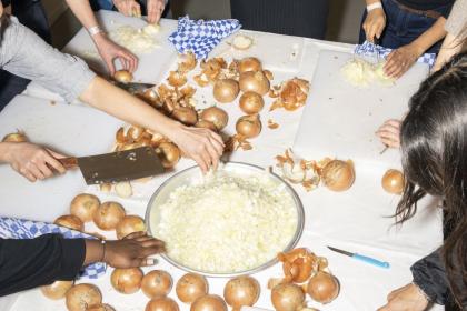 Une autre performance, nous confie-t-elle, était aussi liée au deuil et à la mort. Pour S'occuper de ses oignons, pendant plus d’une heure, elle épluche et coupe des oignons, ce qui a pour effet de la faire pleurer à gros sanglots. Impossible de savoir si ses larmes sont celles en réaction aux effluves des oignons ou celles de l’enfant inconsolable (renoté dans mon carnet) qui pleure encore toutes les larmes de son corps. Généralement, Socheata commence la performance seule mais, au bout de quelques temps, des personnes du public la rejoignent et l’aident à éplucher les oignons, sur son invitation ou même spontanément. Il y a tout de même entre 10 et 15 kg d’oignons sur la table. Et c’est parti pour le concert des reniflements et des sanglots collectifs ! Tout le monde peut y aller de ses larmes, sans se retenir, sans éprouver de honte à le faire en public, puisqu’on le sait, éplucher des oignons ça fait pleurer. La soupe aux oignons qui s’ensuit sera distribuée au public et exorcisera à la fin tous les pleurs et la tristesse dans la joie.