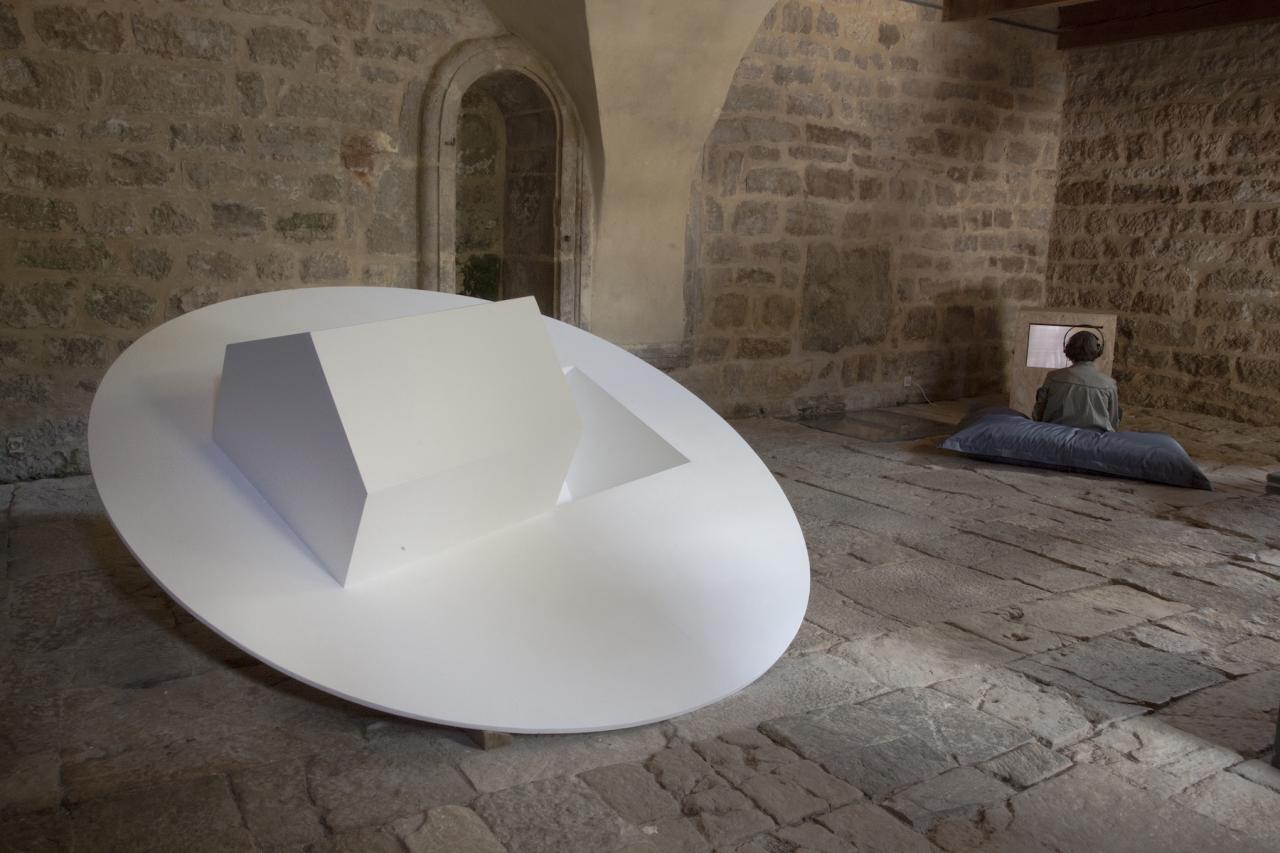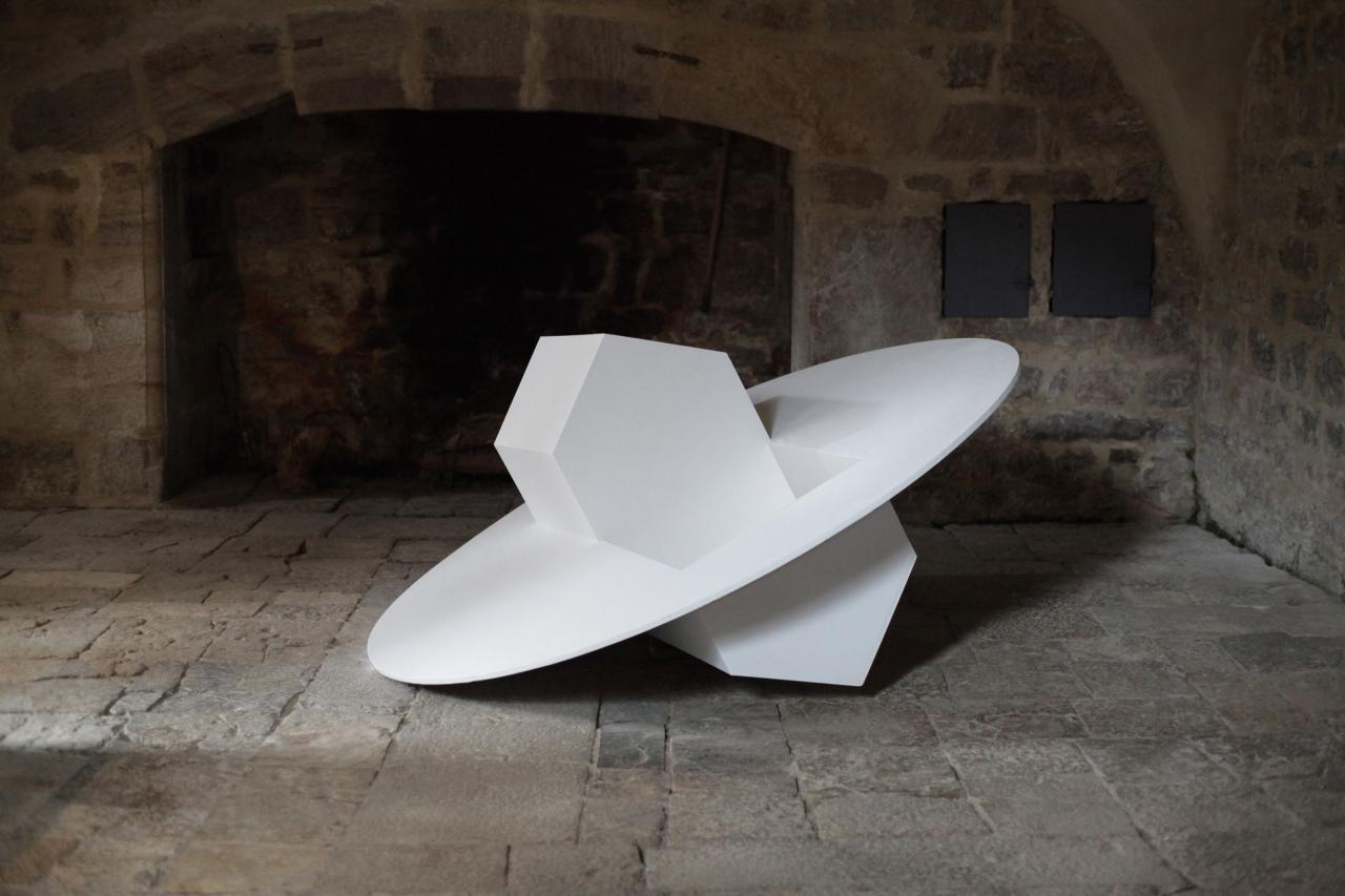 Culbuto 1, 2016, contreplaqué peint, 240 x 240 x 120 cm, vue de l’exposition En orbite dans la tour du Vallon du Villaret, Bagnols-les-Bains