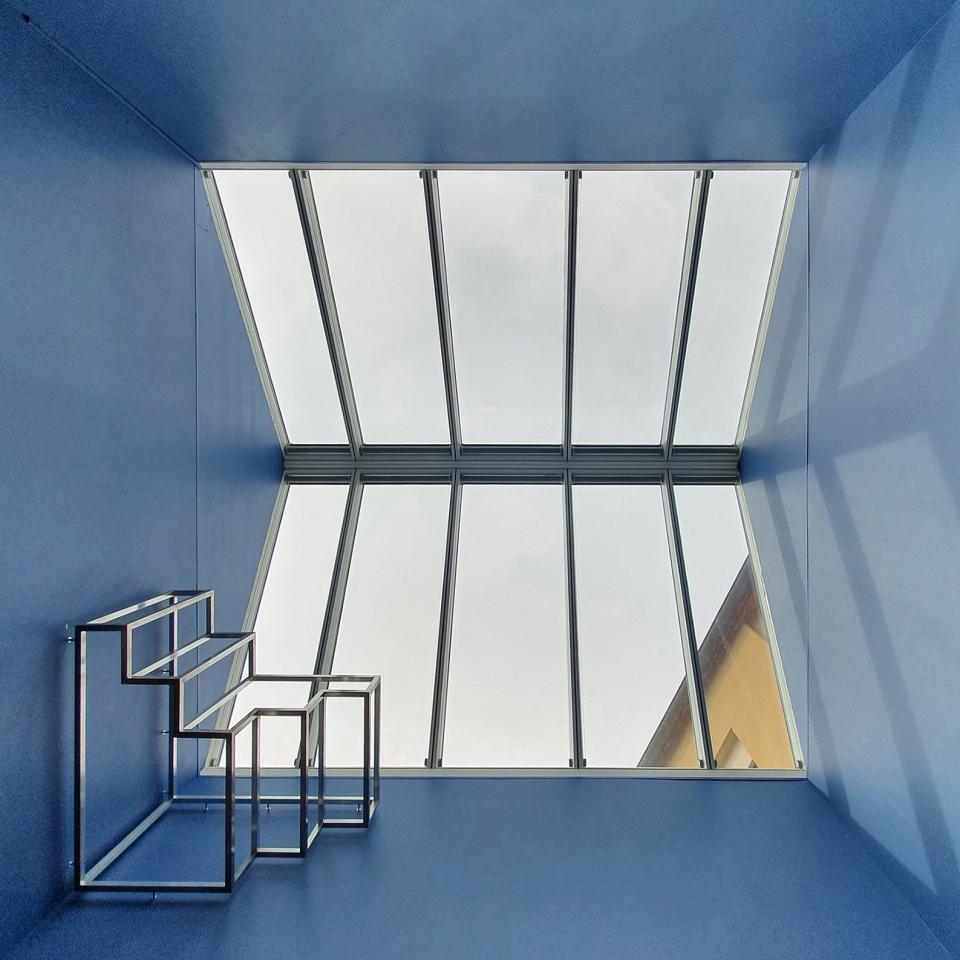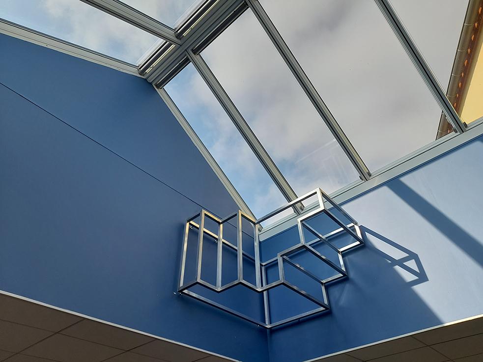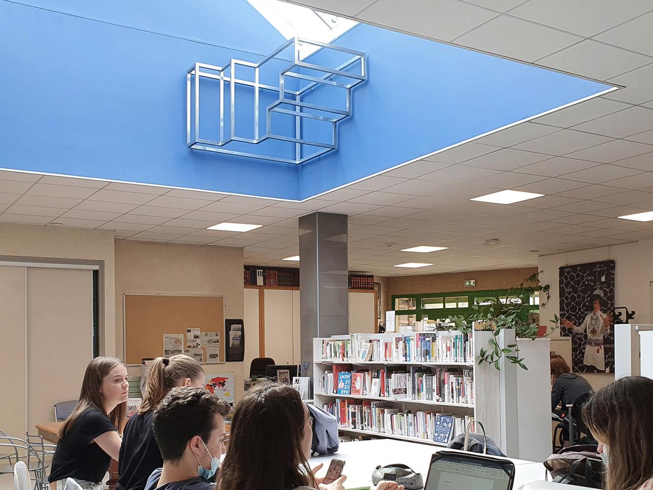 Baignée par la lumière naturelle, Escale fait écho à la volumétrie et à la matérialité de la verrière située au cœur du centre de documentation du Lycée. L’œuvre évoque des marches d’escalier qui se relient pour former un ensemble clos et paradoxal, où l’intérieur et l’extérieur se confondent. Jaillissant d’un angle, Escale attire le regard vers le haut, invitant à sortir de la verrière.