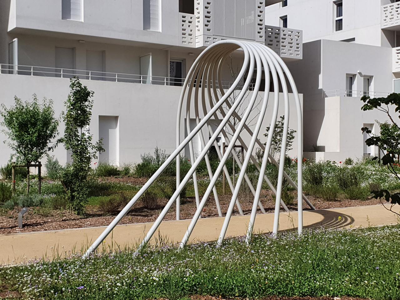 Placée dans l’allée centrale du jardin, cette sculpture créée in situ se déploie au gré des déplacements des résidents. Dans une relation au paysage et à l’architecture, selon les différents points de vue, les lignes s’enroulent ou s’étirent, jouant sur des rapports de symétrie, des dynamiques, des jeux graphiques.