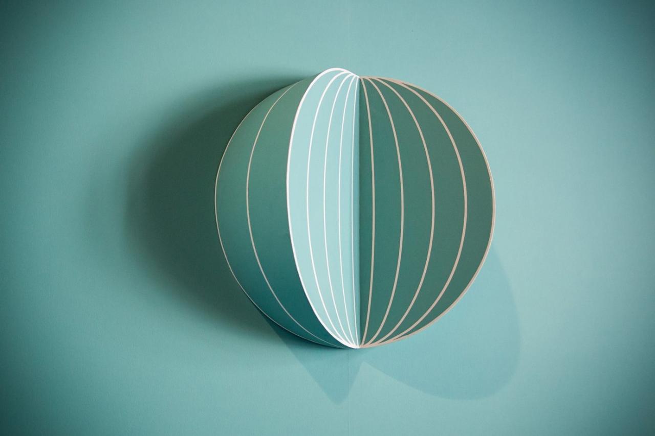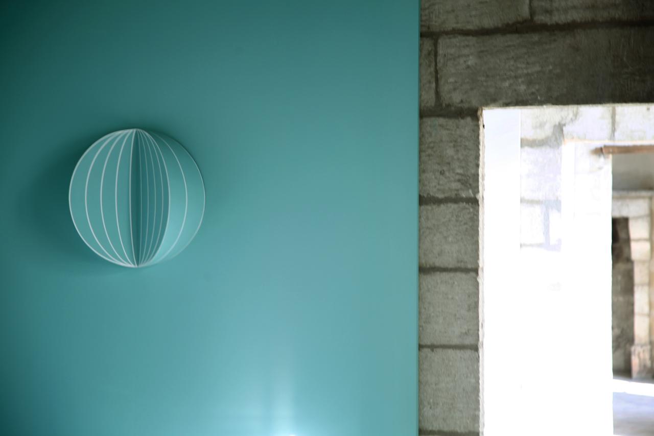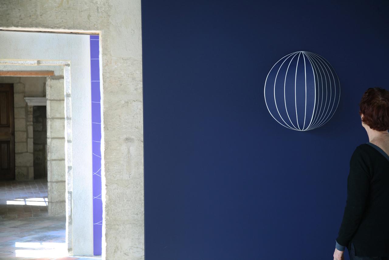 De différente échelle, présentée en trois dimensions ou dépliée en planisphère, en creux ou en bosse au mur, la série est ouverte. La multiplicité des points de vue souligne l’impermanence des choses et la possibilité de créer d’autres réalités, au risque de « dérives et de détournements poétiques 1 ». L’univers muni d’une courbure constante et positive n’est-il pas représenté par une sphère à trois dimensions, une hypersphère à la fois finie et illimitée ? De la ligne à la courbe, la série joue sur la plasticité des formes et avec la vibration perceptive, laissant une place importante à l’errance et à l’imaginaire. Tandis que les monochromes bleus, abstraits et symboliques, renvoient immanquablement au céleste et au terrestre.