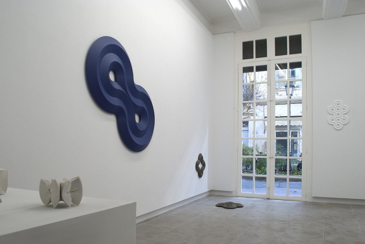 Truchet (blue velvet), 2019, polyurethane laqué, 150 x 80 x 8 cm, vue de l’exposition personnelle Sinuosités, Galerie AL/MA, Montpellier, photo Elena Salah