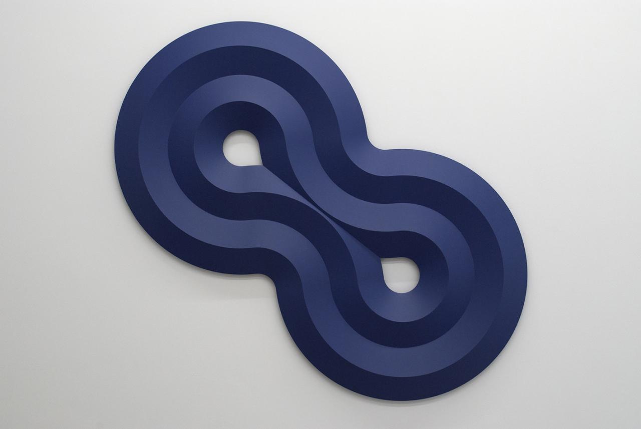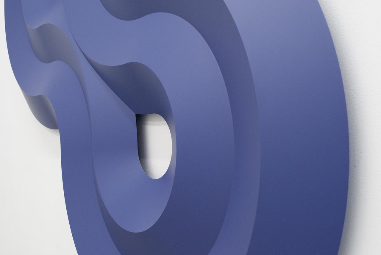 Truchet (blue velvet), 2019, polyurethane laqué, 150 x 80 x 8 cm, vue de l’exposition personnelle Sinuosités, Galerie AL/MA, Montpellier, photo David Huguenin