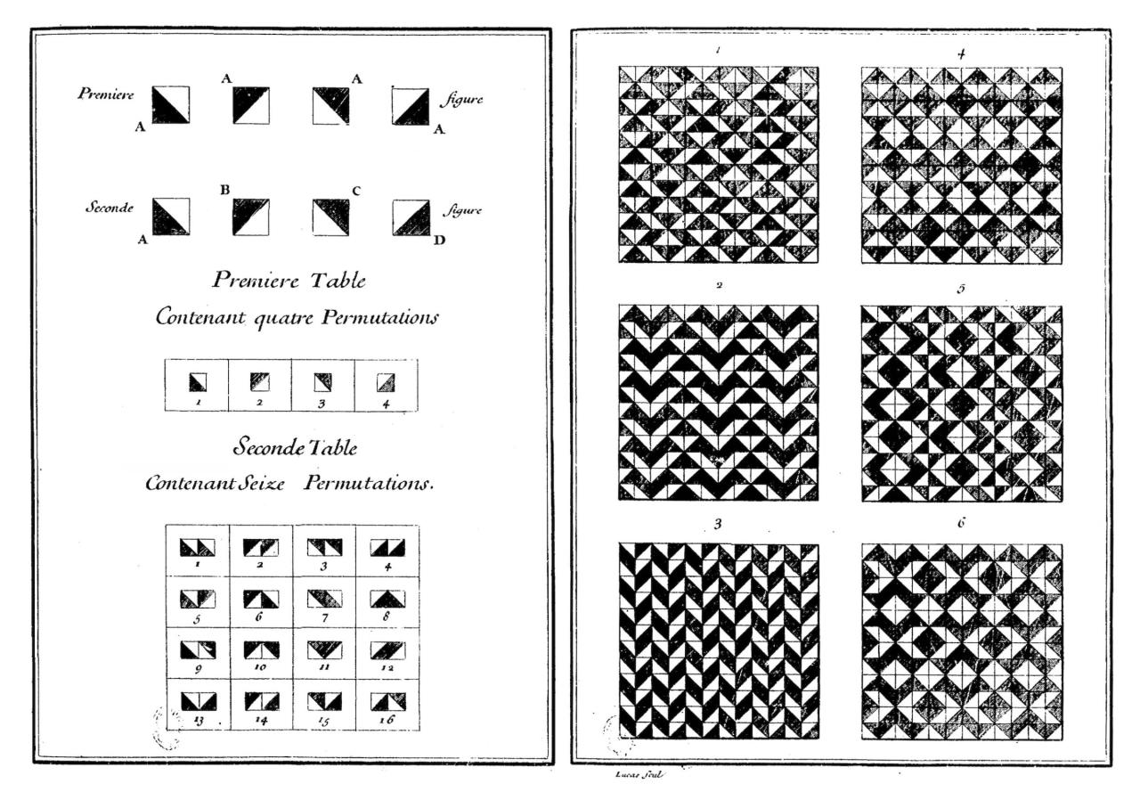 Méthode pour faire une infinité de desseins différens, avec des carreaux mi-partis de deux couleurs par une ligne diagonale. Ou Observations du P. Dominique Douat,… sur un Mémoire inséré dans l’«Histoire de l’Académie royale des sciences de Paris, l’année 1704», présenté par le R. P. Sébastien Truchet,.., 1722, source Gallica