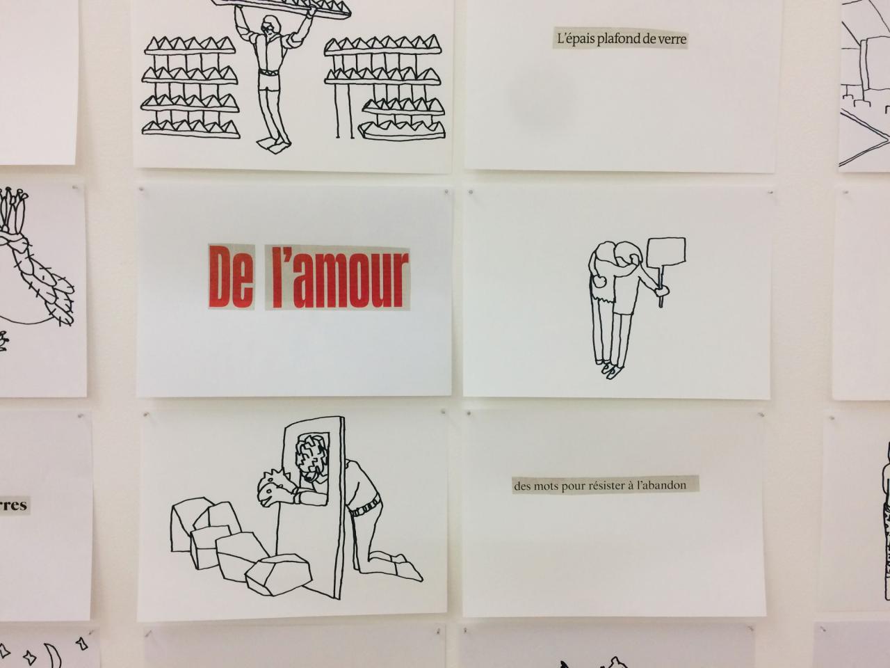 Valérie du Chéné et Arlette Farge, Le Piège, 2020, série de 135 dessins et titres de journaux, vue de l’exposition Dessins extimes, Maison Salvan, Labège, 2021