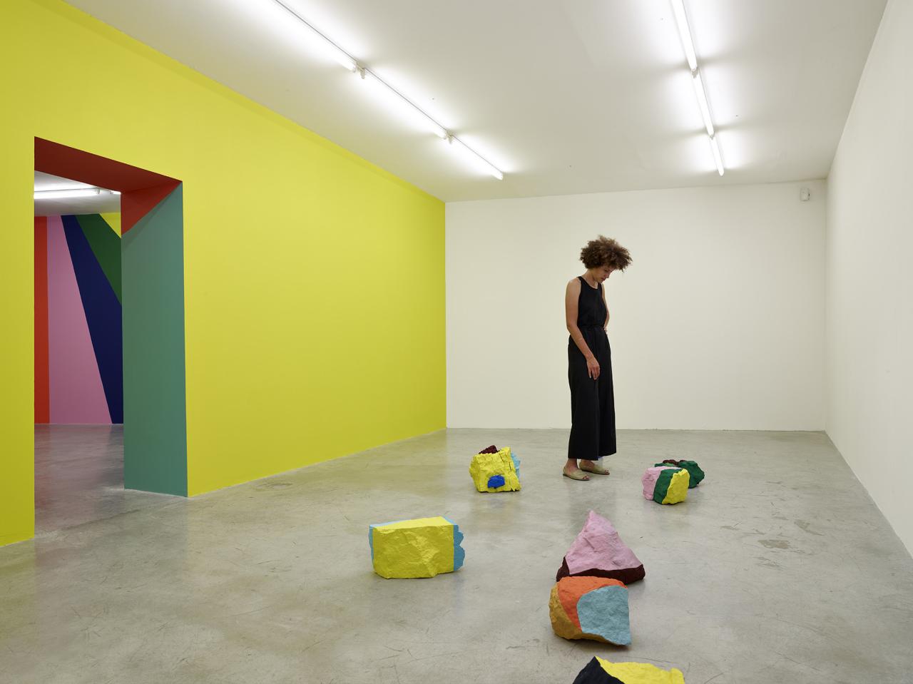 , les pierres sont associées à une peinture murale monumentale qui se déploie sur plusieurs étages. Le spectateur qui les arpente fait l’expérience de la couleur, marche dedans, son « corps [comme] embarqué dans l’espace »10