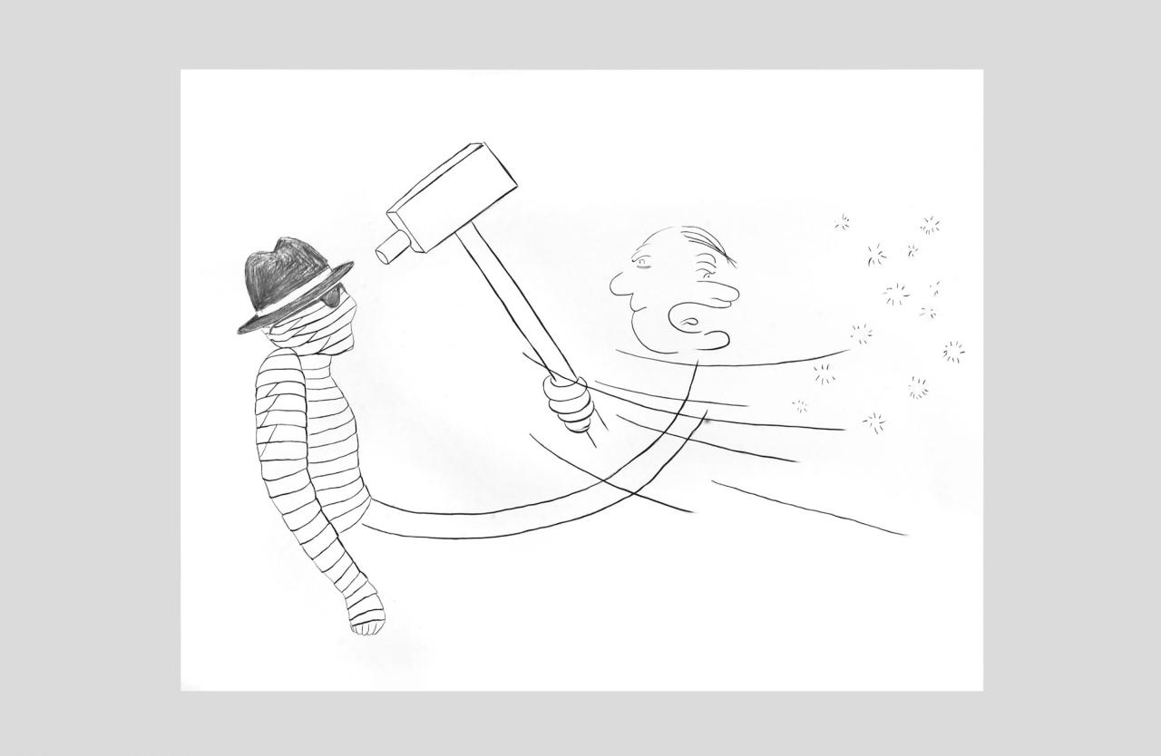 C’est un personnage à peine esquissé, fripé, très vieux qui, hiératique, brandit avec assurance un très long bâton brisé en plusieurs morceaux formant le chiffre romain “neuf”. Il est écrit “Faire du vieux avec du neuf”. C’est la parabole de la simulation du changement et de la nouveauté présentée par quelqu’un qui ne semble pas en avoir les compétences.