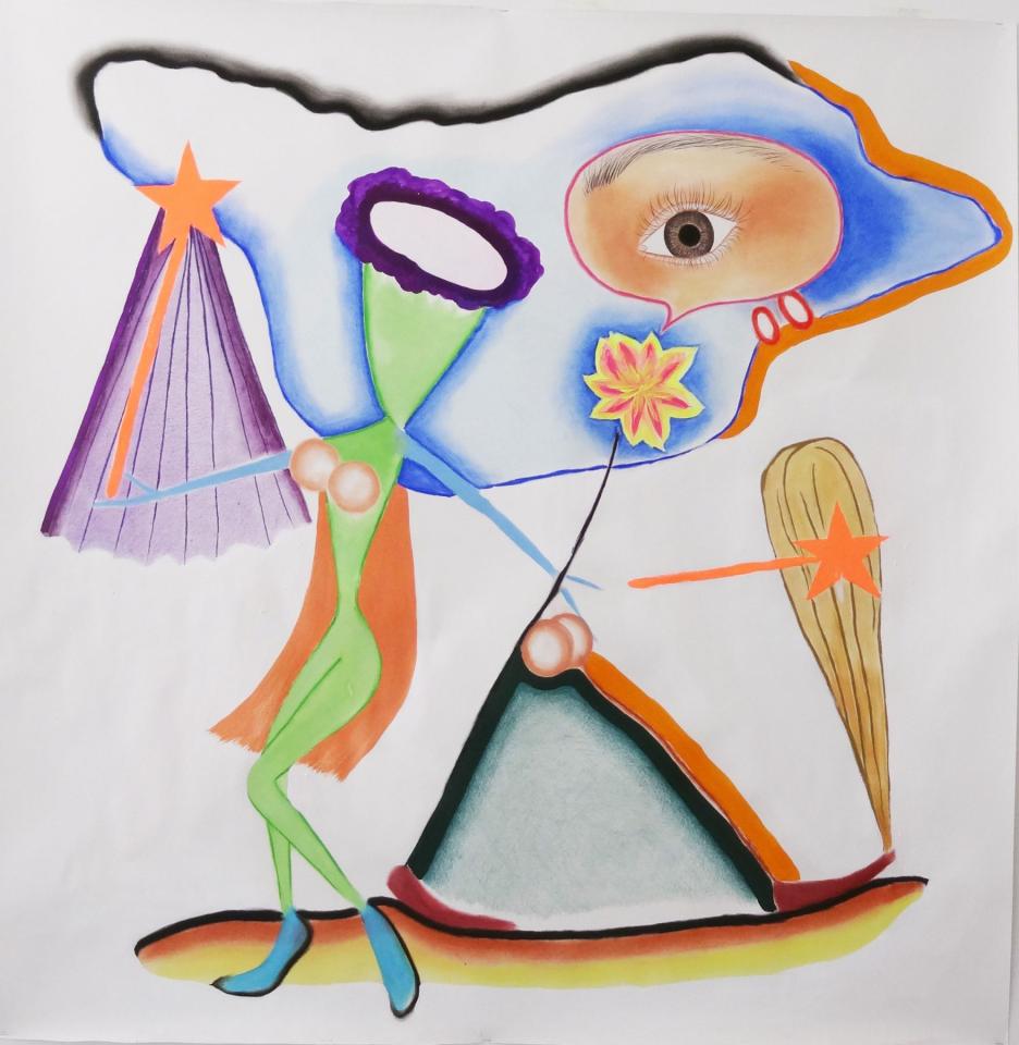 Il s’agit d’une scène burlesque réunissant deux créatures. L’une possède une tête humaine au teint jaune fluorescent, pourvue de très longues oreilles d’âne bleutées, vêtue d’une longue jupe noire étroite comme un socle. Ce personnage brandit deux paires de lunettes ou peut-être des masques occultants, colorés roses et oranges. L’autre créature, effrayée ou surprise, a un mouvement de recul. C’est une présence spectrale, moribonde, énucléée faite de tracés dynamiques violets verticaux. Au-dessus de la scène, des étoiles scintillent d’une tonalité chaude comme un feu d’artifice. Au sol, gît un amas de boules ressemblant à des globes oculaires encerclés d’une ligne rose et verte. Il est question parmi les artifices, d’un semblant de propositions de visions édulcorées, vaines et inappropriées infligées à un personnage incompris dont la détresse et la dépossession du savoir symbolisé par les globes oculaires au sol est proportionnelle à l’inexorable et répétitive privation de libre arbitre.