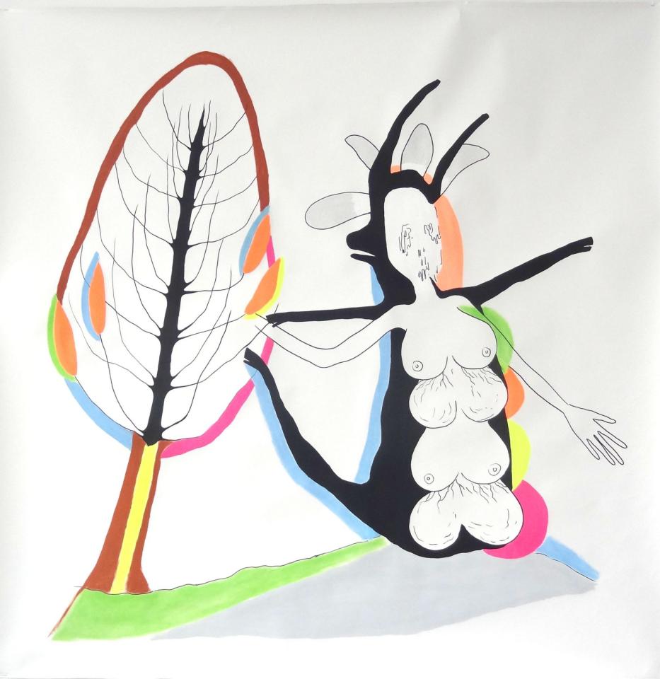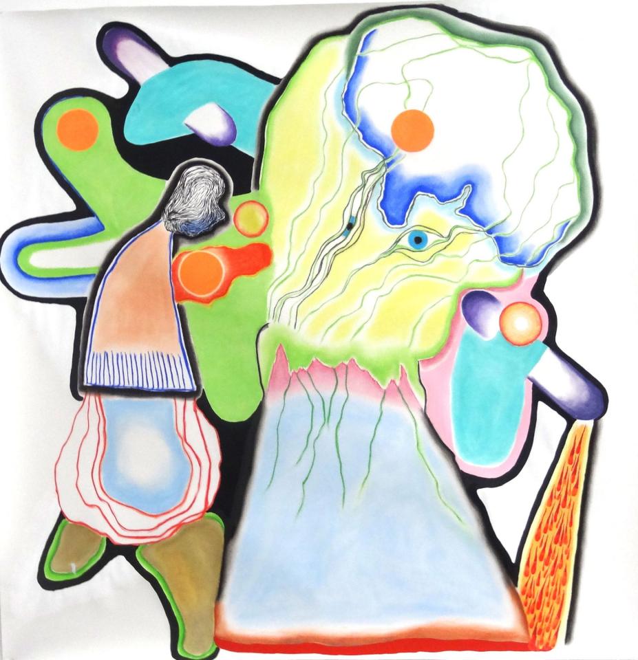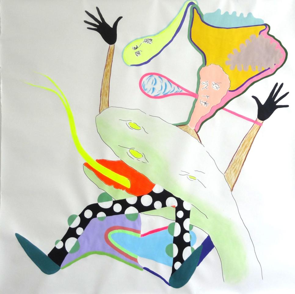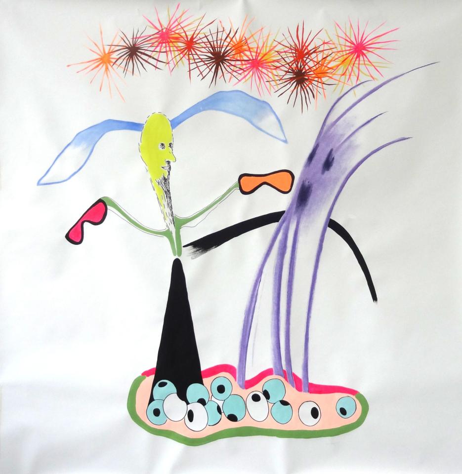 Dans le grand format dessiné 55 on aperçoit une imbrication de formes libres et d’autres géométriques agrégées à deux créatures. L’une d’elle contient dans sa tête une excroissance anthropomorphe à l’œil solaire d’où partent des filaments comme un réseau fluvial, nerveux, sanguin qui irrigue la créature et semble se déverser dans sa tête. Il est question des territoires de la pensée et de la transmission de celle-ci.