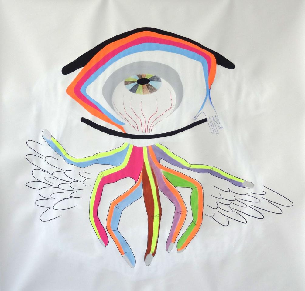 Il s’agit d’une créature formée d’un globe oculaire à la pupille irisée en guise de tête et de huit doigts de plusieurs couleurs et aux ongles scintillants. Ces doigts, comme une multitude de pattes, ondulent et déploient deux ailes blanches. Une main prolongée d’un bras entoure la tête-œil et paraît tenir ou lâcher une barre noire enserrant le cou. Elle est prête à étrangler ou décapiter. Le bras et la barre noire forment un œil à la pupille tournée vers le haut. C’est une vision acidulée et optimiste d’une menace latente ou bien évitée envers l’intelligence, la création et la liberté.