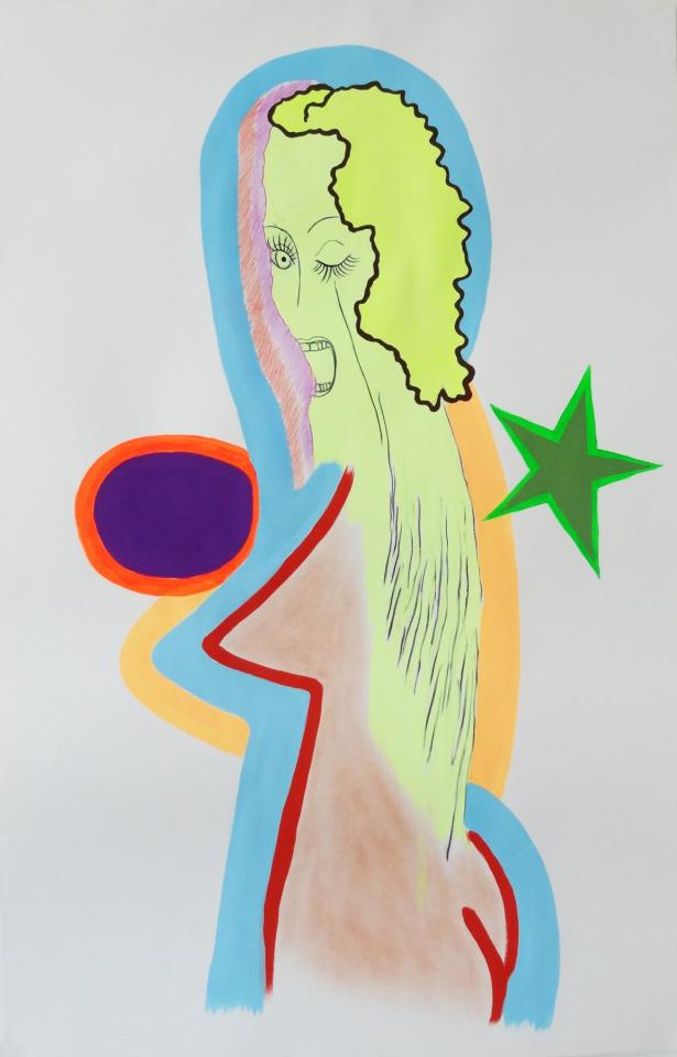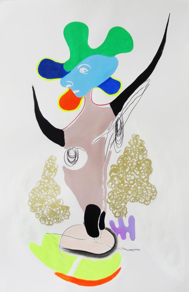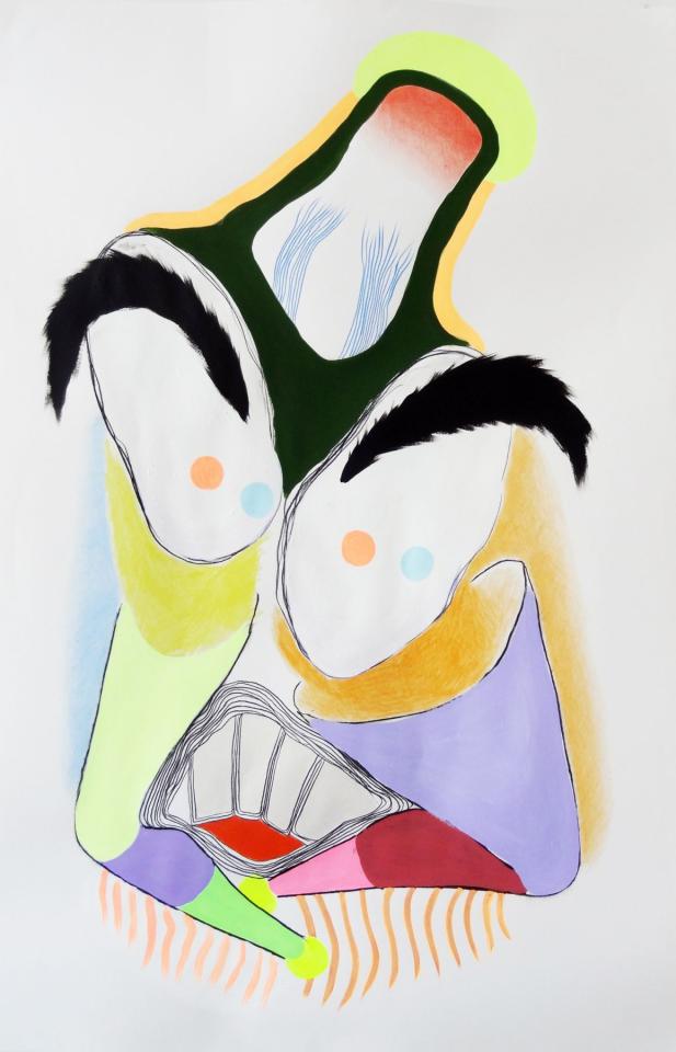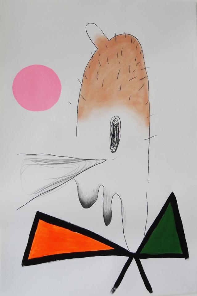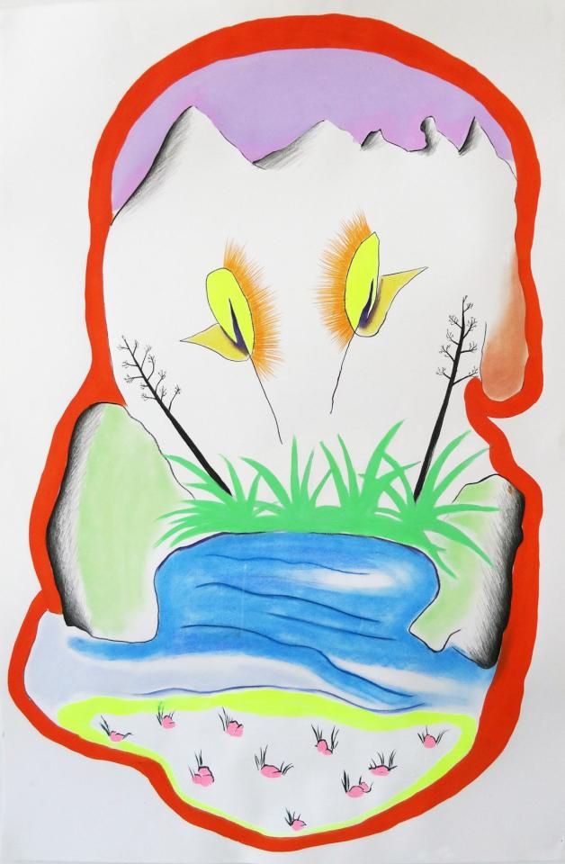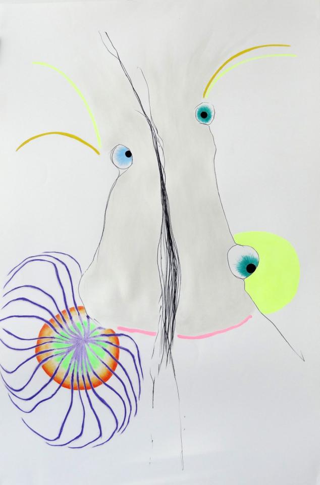 C’est une forme nacrée surmontée de trois pupilles bleue et turquoises à l’expression stupéfaite et curieuse. La forme est solidaire d’un socle, près duquel ondule une forme circulaire multicolore prolongée de filaments violets. Il s’agit d’un corail pourfendu par la moitié et blanchi par une eau devenu acide et plus chaude.
