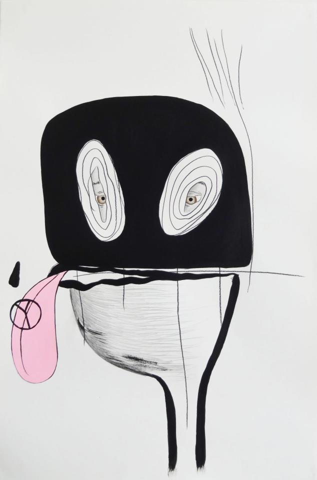C’est une tête dont la partie supérieure est dissimulée par une cagoule noire jusqu’à la bouche. Les yeux à peine visibles sont cernés de plusieurs cercles qui accentuent l’effet hypnotique. Les pupilles sont fixes et froides malgré leur coloration brun chaud. La bouche découpe le visage en deux, à l’image d’un Pacman goulu, affublé une langue pendante rose prête à avaler le sigle peace and love tel un caméléon capturant un insecte. L’ensemble est percutant car il oppose en un contraste maximum des aplats blancs et noirs, seule la langue rose adoucit l’image. C’est l’image d’une menace masquée qui nous fait fasse, frontale et latente mettant la paix en danger.