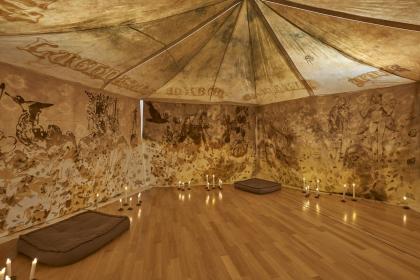 T.NDA : Le personnage de la sorcière, comment il se manifeste dans les œuvres présentes pour l’exposition ? Que signifient les mots que l’on peut lire sur le toit de Flux énergétique - La forêt temple, sacrée - Cœur de nos solstices ?
