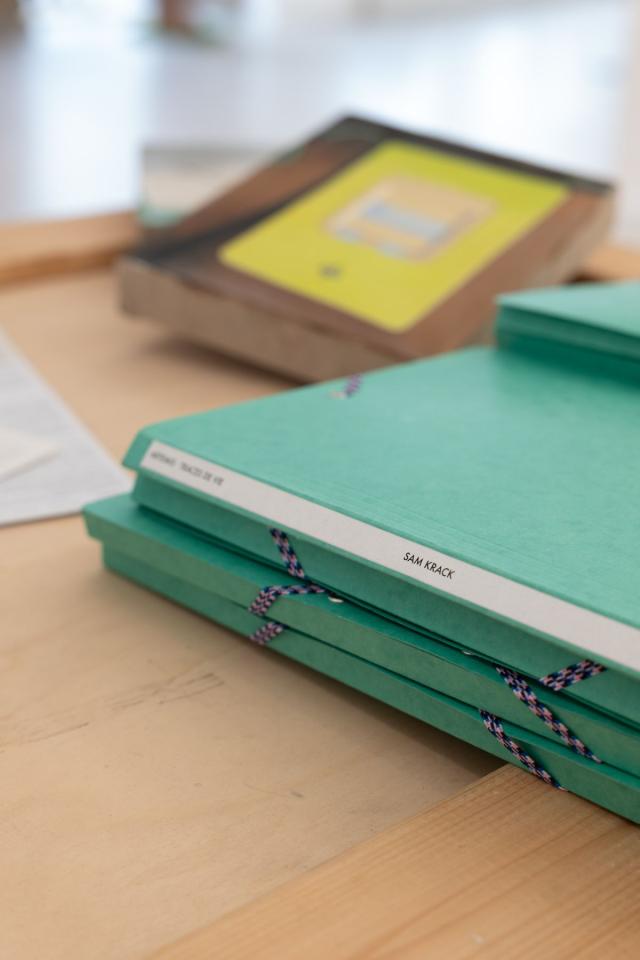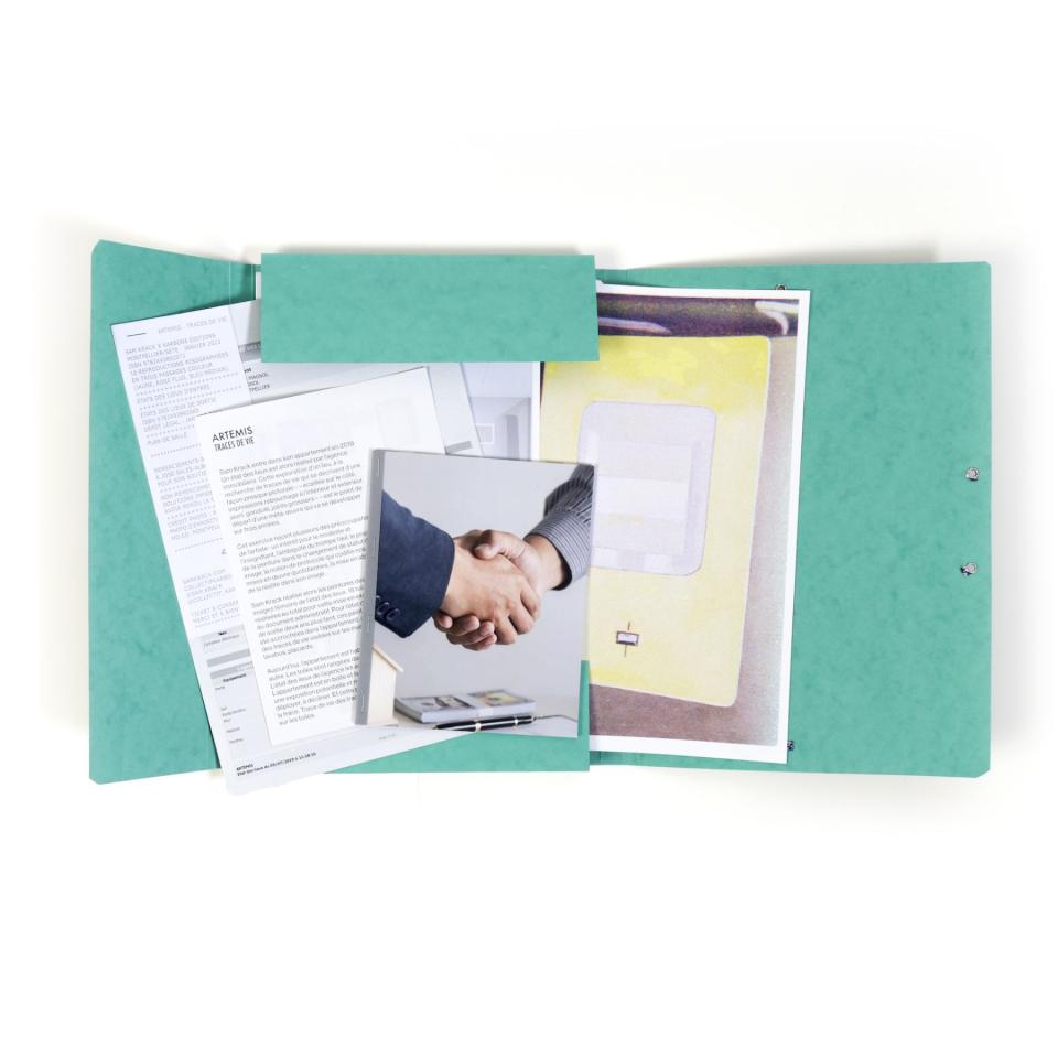 Le coffret Artemis - Traces de vie rassemble 18 reproductions des toiles de Sam Krack imprimées en risographie trois passages, un exemplaire de l’état des lieux d’entrée, un livre présentant les toiles exposées dans l’appartement lors de l’état des lieux de sortie face à des images de synthèse d’agence immobilière, un index des peintures et un texte de Pauline Faure.